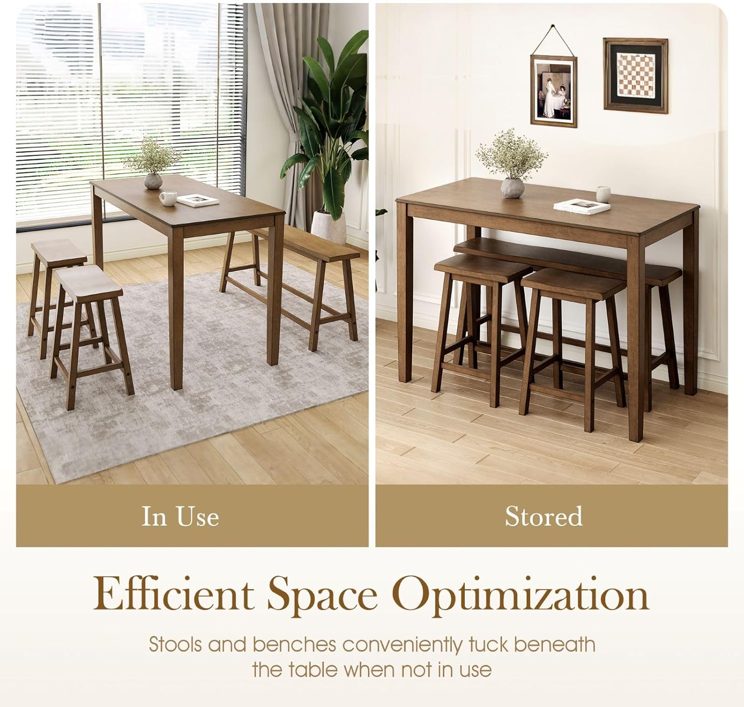 Space-saving DesignDesigned with practicality in mind, the bench and chairs can be tucked neatly under the table when not in use, maximizing the use of space, perfect for apartments or smaller rooms, keeping the room neat and organized