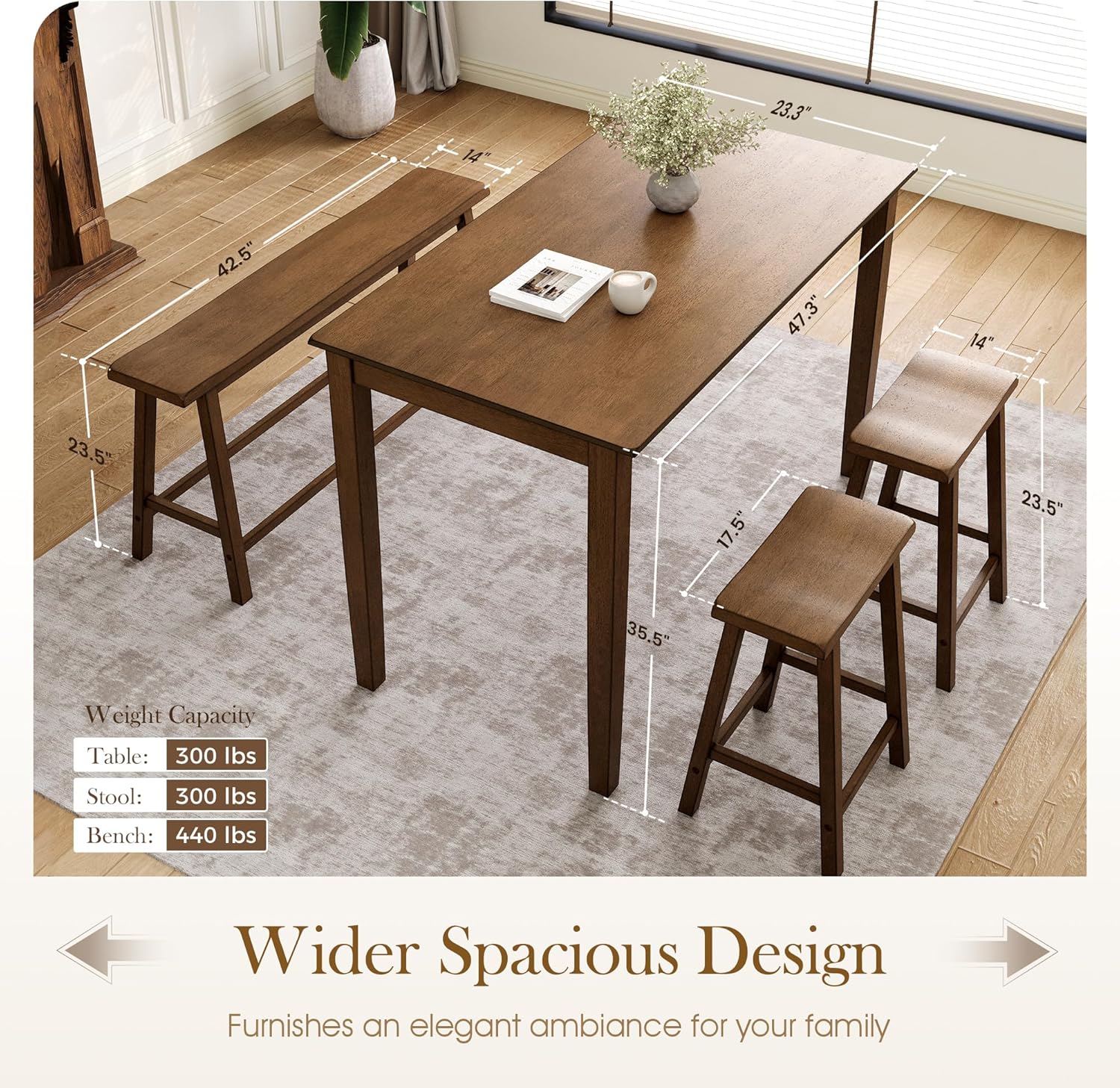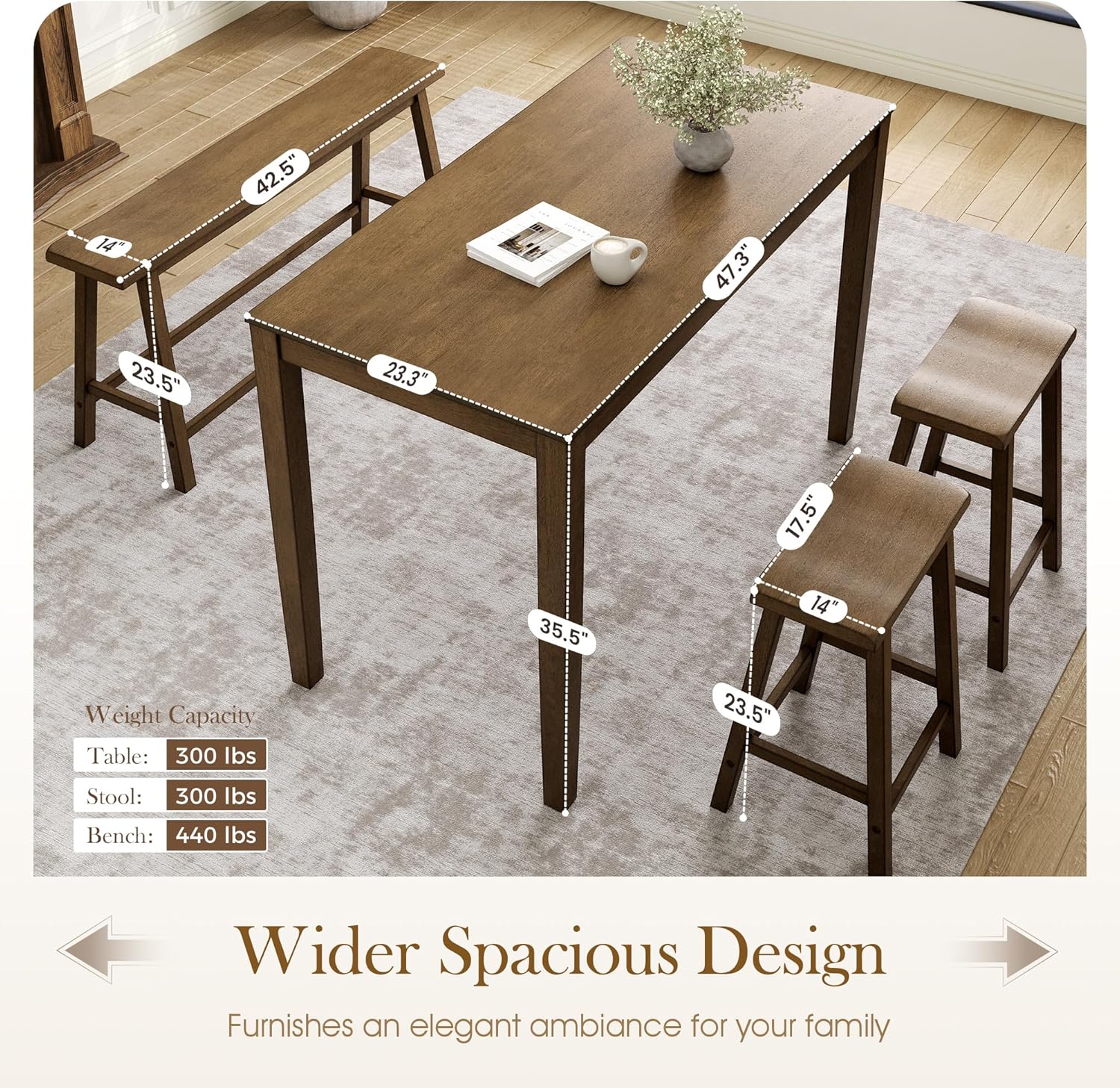 DimensionsBar Table: 47.3"L x 23.3"W x 35.5"H; Chair: 17.5"L x 14"W x 23.5"H ; Bench: 42.5"L x 14"W x 23.5"H. Elevate your dining experience with the Dining Set!