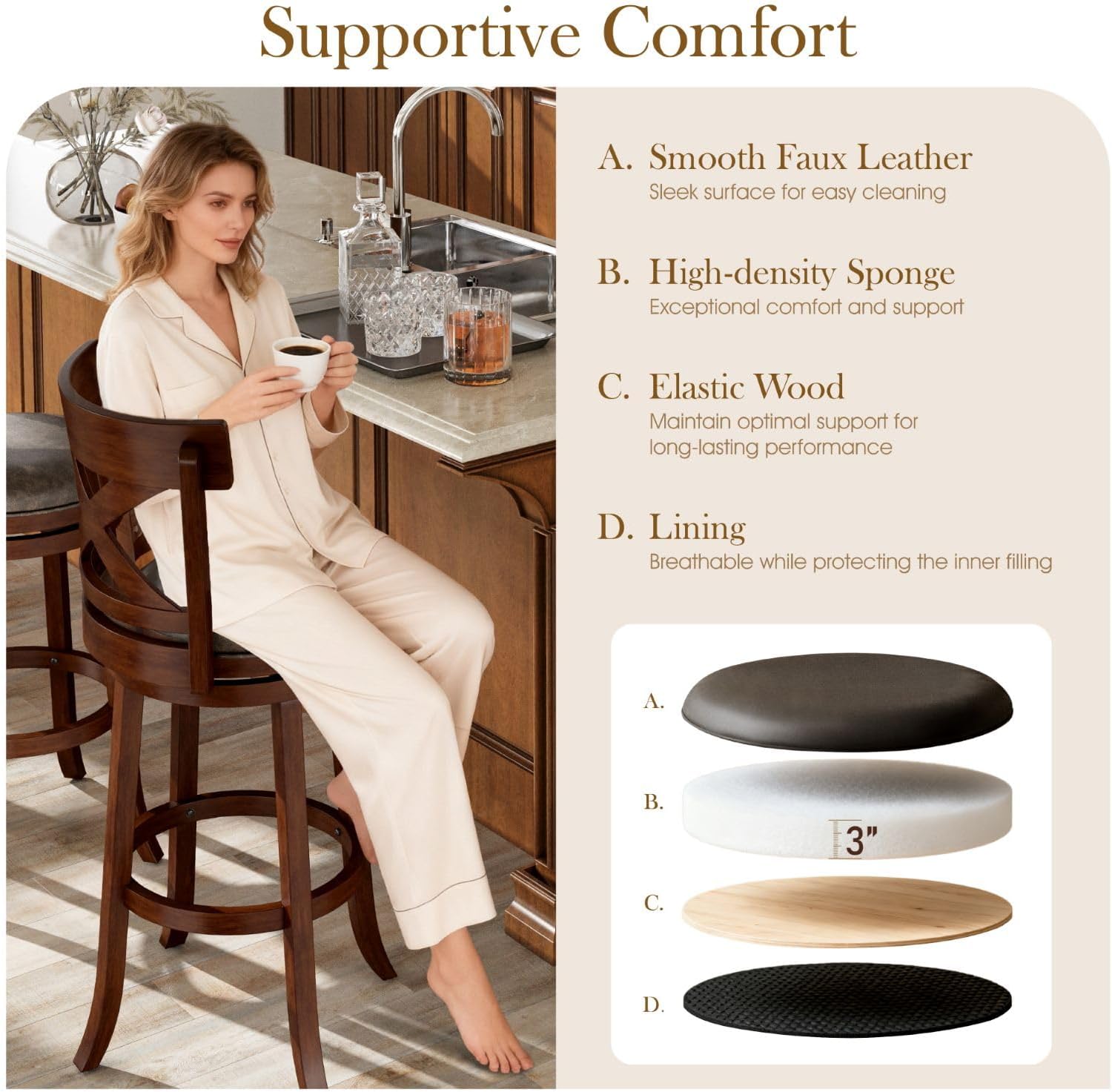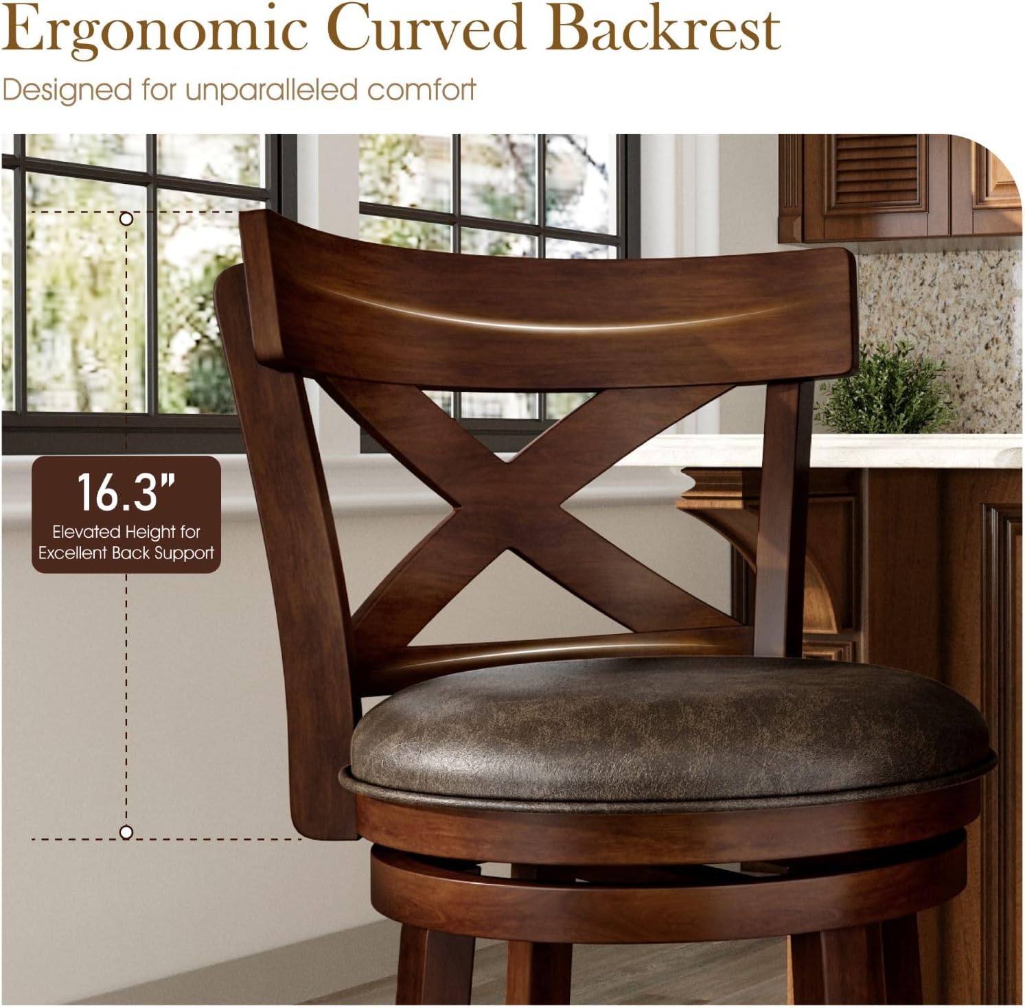 Ergonomic Backrest Bar StoolThe swivel bar stool with a wooden backrest attaches great importance to ergonomic design. The seat and backrest are perfectly fitting the body's contours and providing excellent support for the back, waist, and hips. This enables users to maintain a comfortable sitting position for long periods without feeling fatigued .