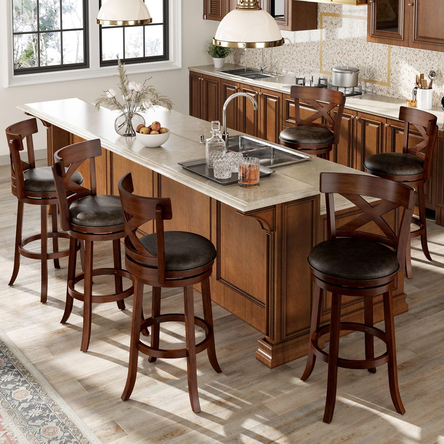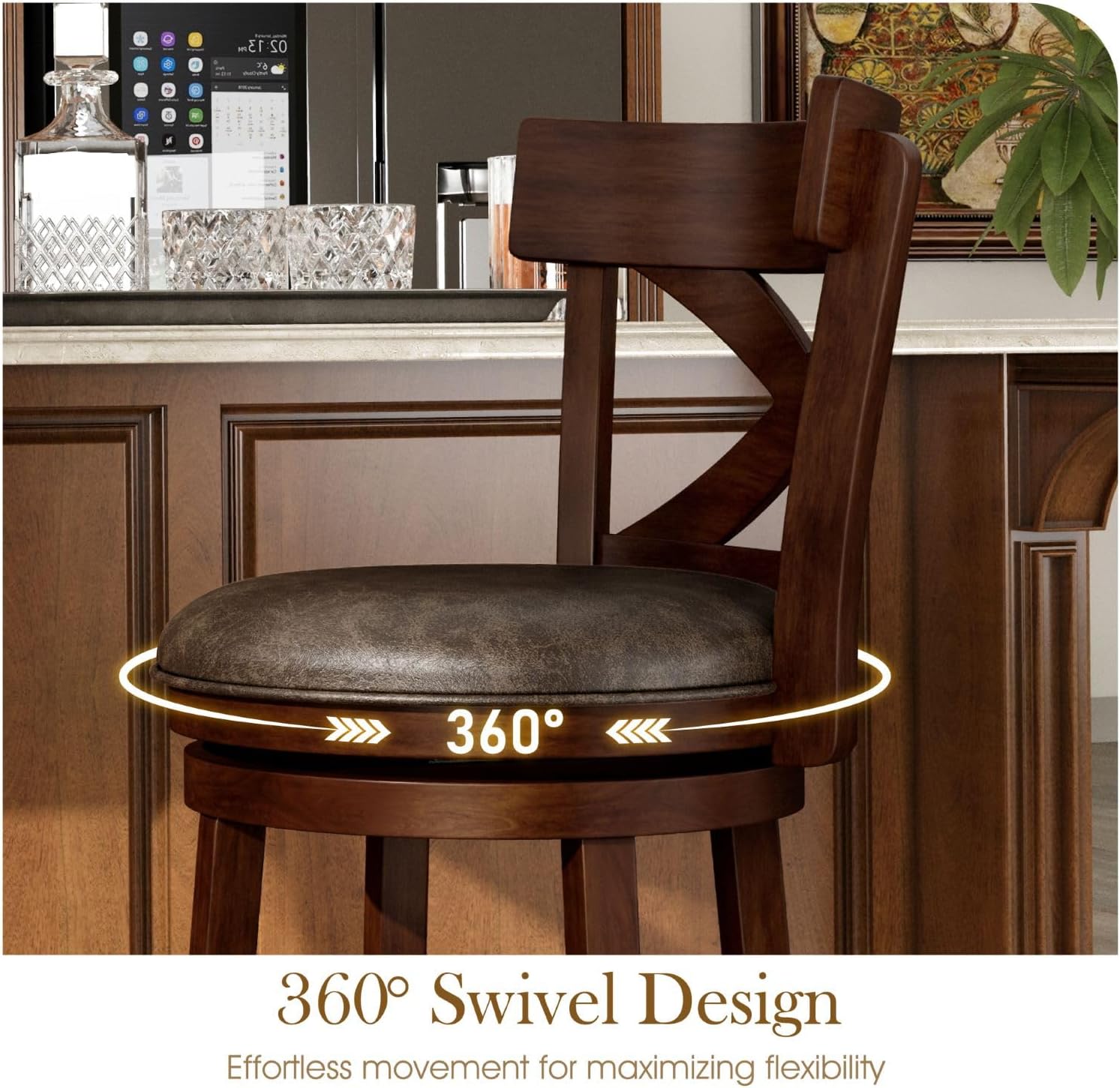 360Swivel Bar StoolThe bar stool adopts a unique 360-degree rotating circular seat design. You can move freely or interact with others without having to reposition the entire chair. This design makes your chatting with friends more flexible and comfortable.