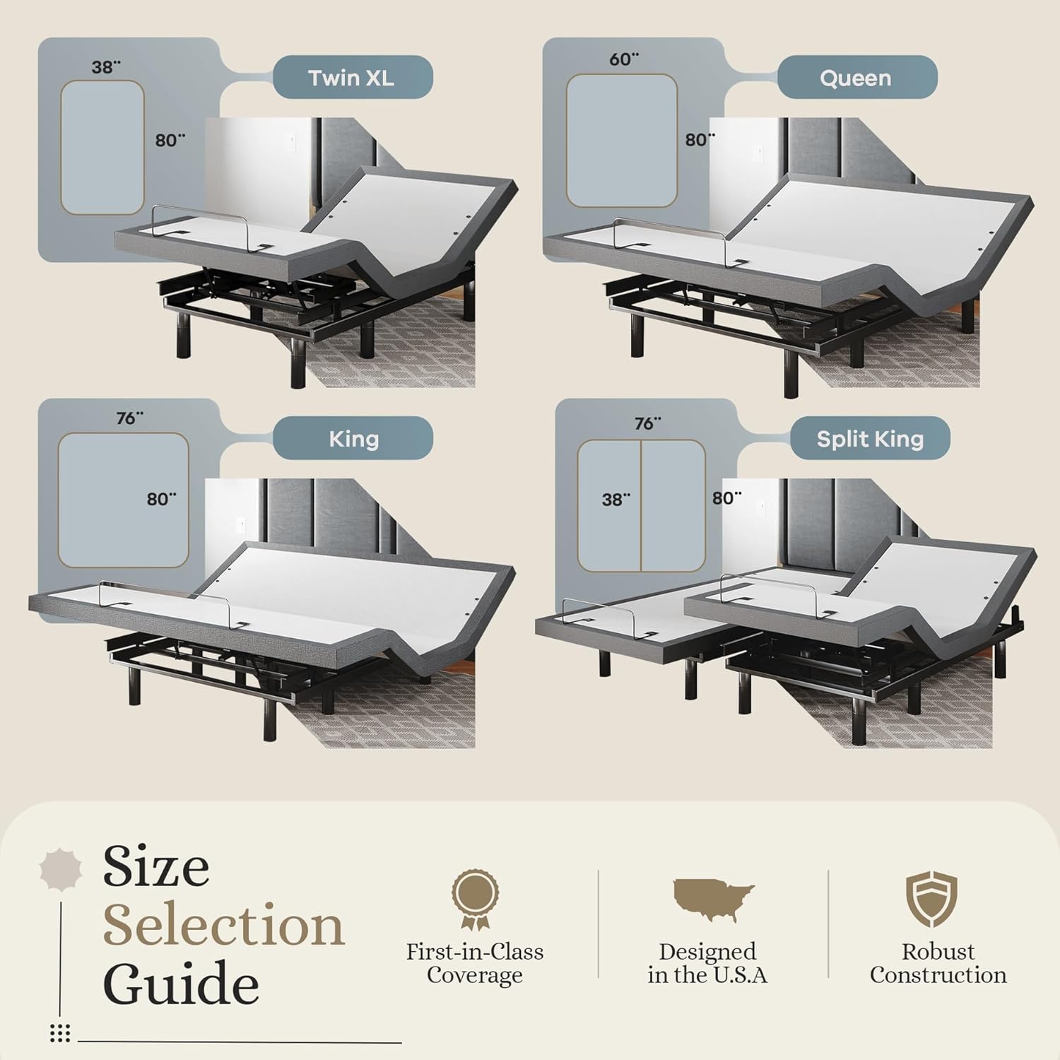 Innovative Ergonomic Remote: Dive into a realm of relaxation with settings such as Zero Gravity for weightlessness and Anti-Snore for unobstructed breathing. The remote boasts memory positions to save your favorite settings, under-bed lighting for soft illumination, and dozens of other features to bring you personalized comfort.