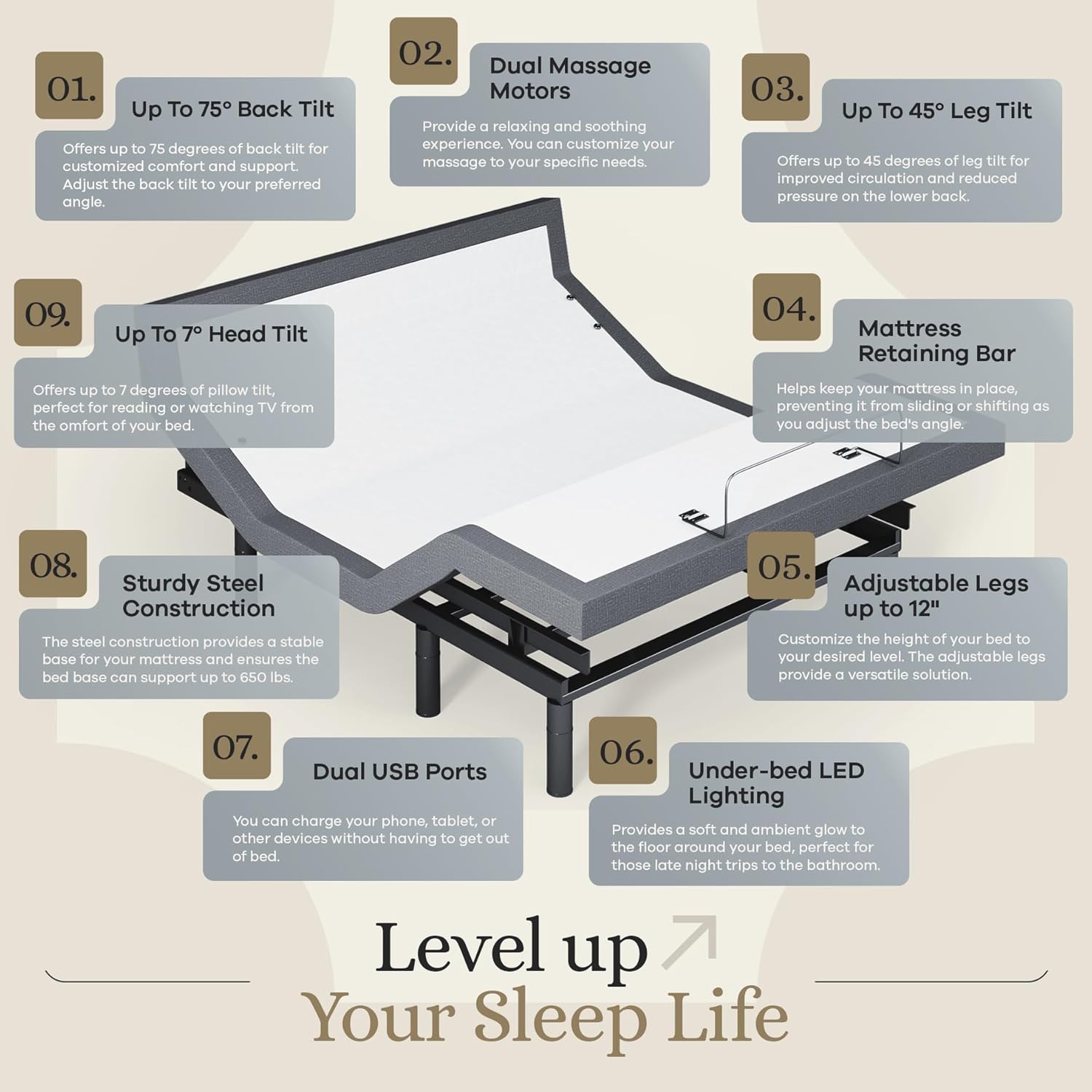 Comprehensive Warranty & Features: Beyond unmatched coverage with our 25-year warranty (a $299 value), this bed frame promises durability and reliability. The mattress retention system ensures stability, while adjustable legs cater to your height preference. Every feature, from the emergency power-down to the remote layout, has been thoughtfully designed for your convenience.
