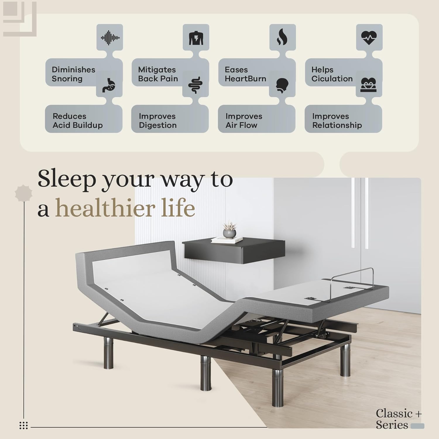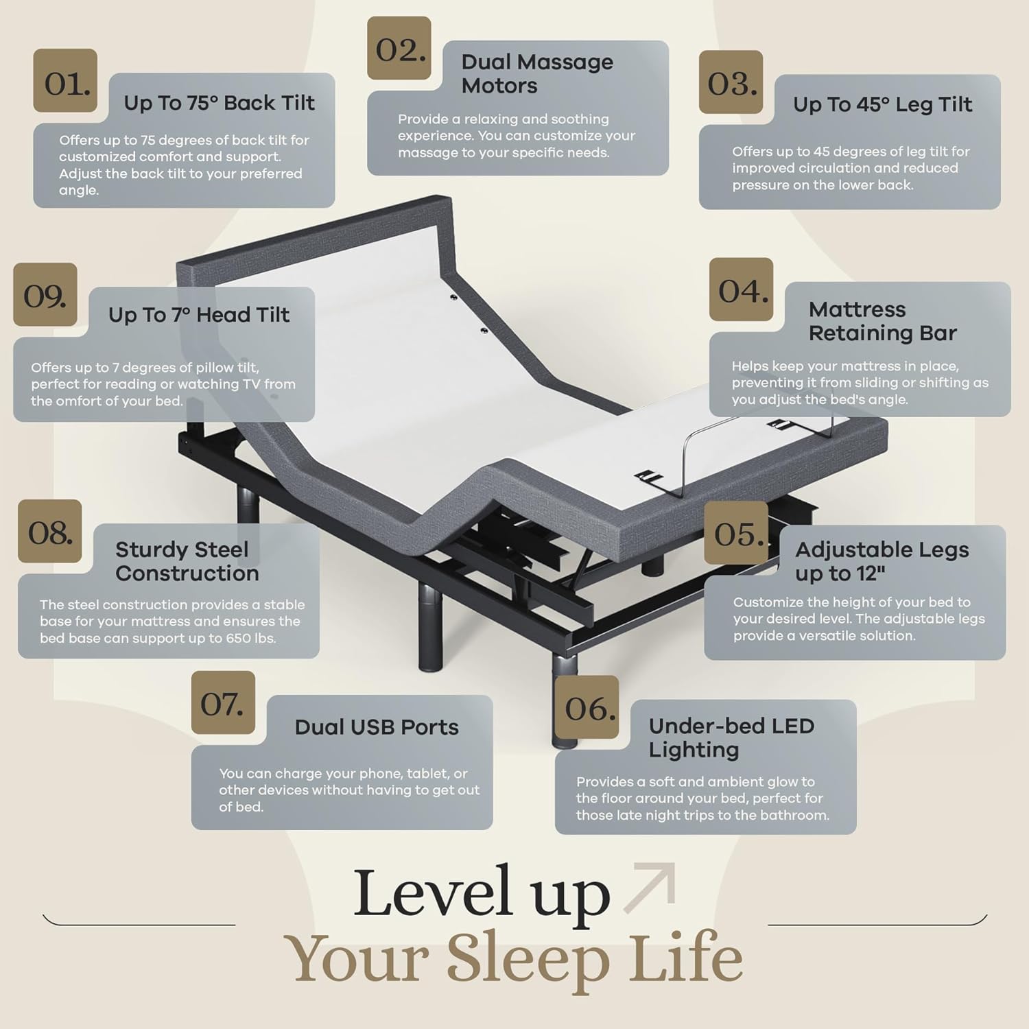Unmatched Comfort & Adjustability: Elevate your sleeping experience with our head (up to 75) and foot (up to 45) lift mechanism, allowing for perfect positioning. The additional head (pillow) tilting feature provides personalized comfort. By adjusting your sleeping position to the ideal angle, you can benefit from clearer airways, decreased congestion, lessened snoring, and better spinal alignment to ease back pain.