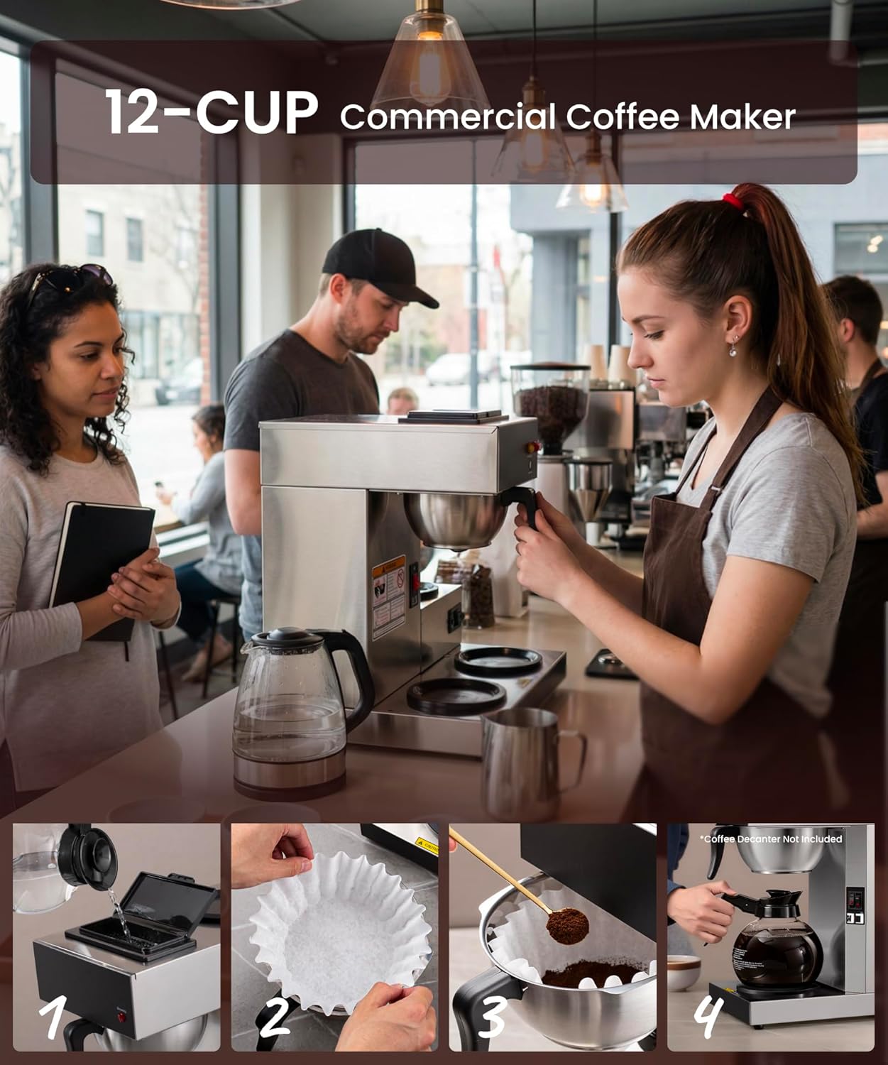 • Commercial Coffee Maker 12 Cup, Pour Over Drip Coffee Maker Brewer with 3 Lower Warmers, Stainless Steel Cafetera
