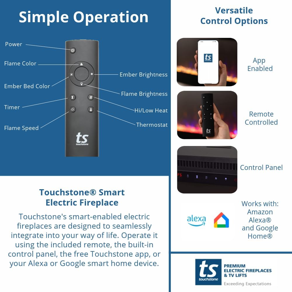 ADVANCED FEATURES: The Sideline Elite 60 has 6 flame color options and 10 media color options that run independently, a thermostat from 68-88 degrees F, ability to remember flame settings and be turned on by a light switch or smart device, 3 flame speeds, 5 flame and fire bed intensity settings, can be plugged in or hardwired, and comes with a full log-set, driftwood, and crystals. The minimal frame surround and large flame viewing emphasize the spectacular fire quality.