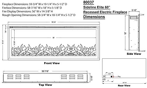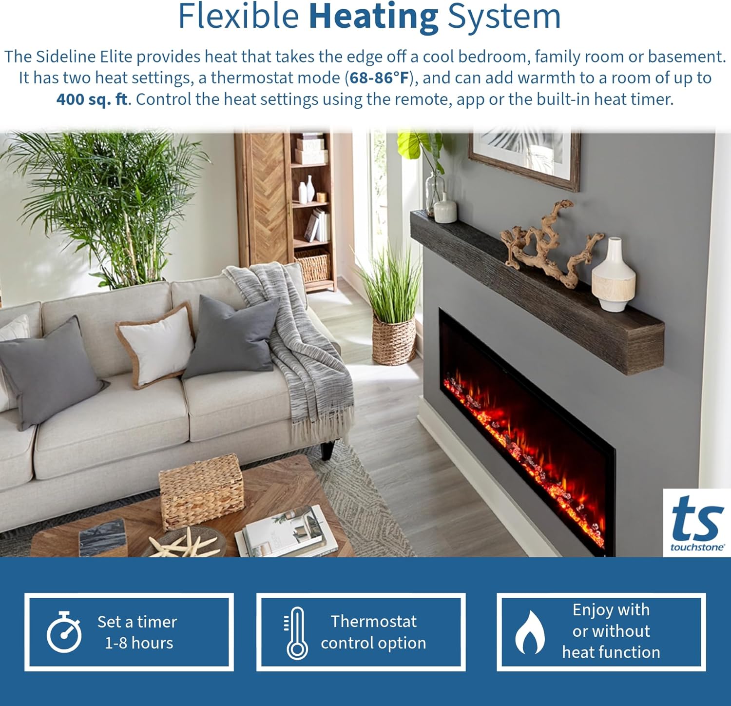 PERFECT FOR SUPPLEMENTAL HEAT: Ideal for adding heat to a room, the Sideline features two heat settings: high and low. The thermostat goes from 68-88 degrees F and includes a timer 1-8 hours. Heat vents are located on the upper front area. The heat level can be adjusted according to the users preference, making this fireplace a functional and practical fixture. The total dimensions of this unit are 59 3/4" wide x 19 1/4" high x 5 1/2" deep. The recessed dimensions are 58 7/16" wide x 18" high x 5 1/8" deep.