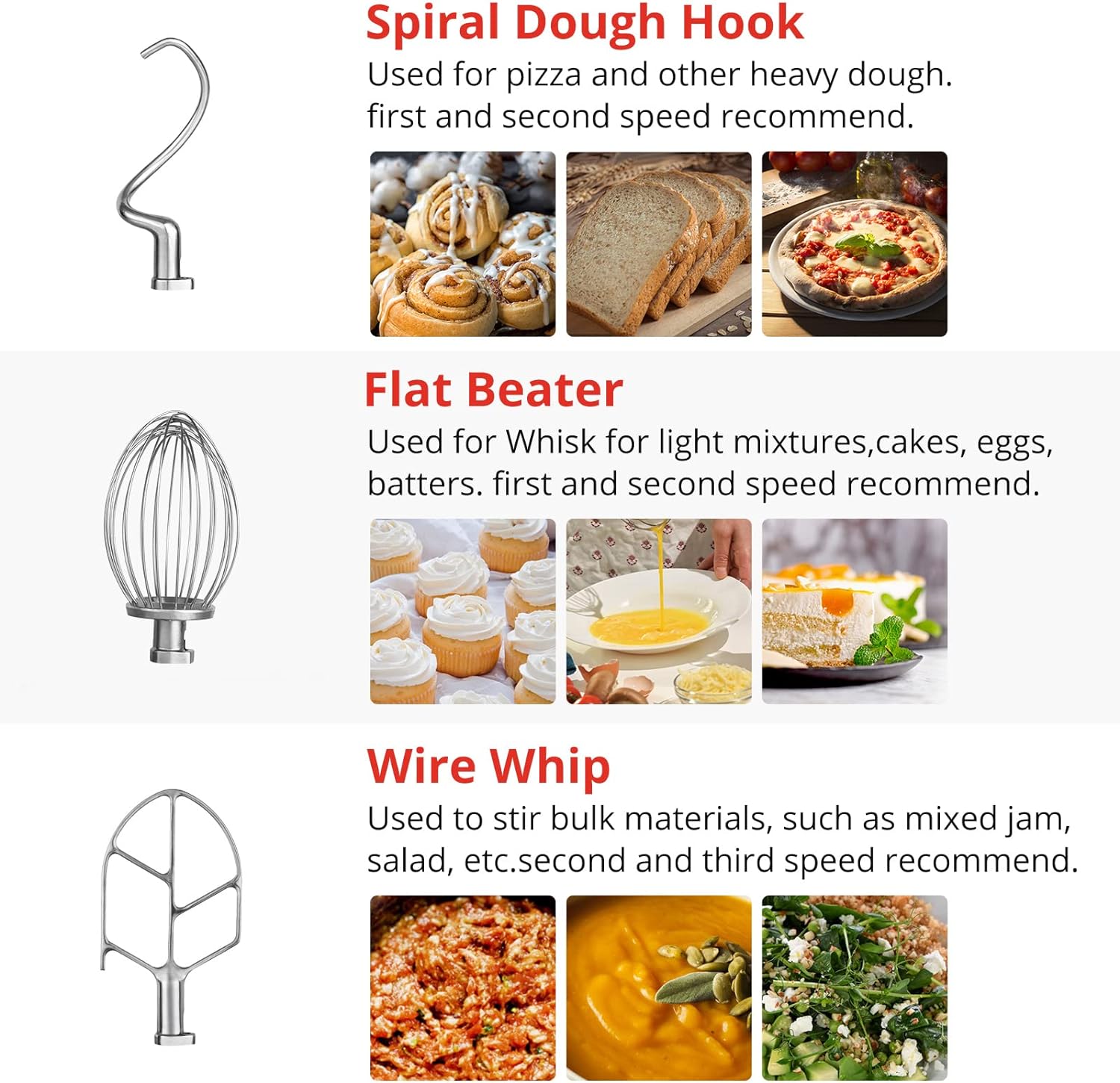 Three Replaceable Attachments: Spiral Dough Hook, Flat Beater, and Wire Whip, suitable for different ingredients, such as pizza dough, light mixtures, and bulk materials.