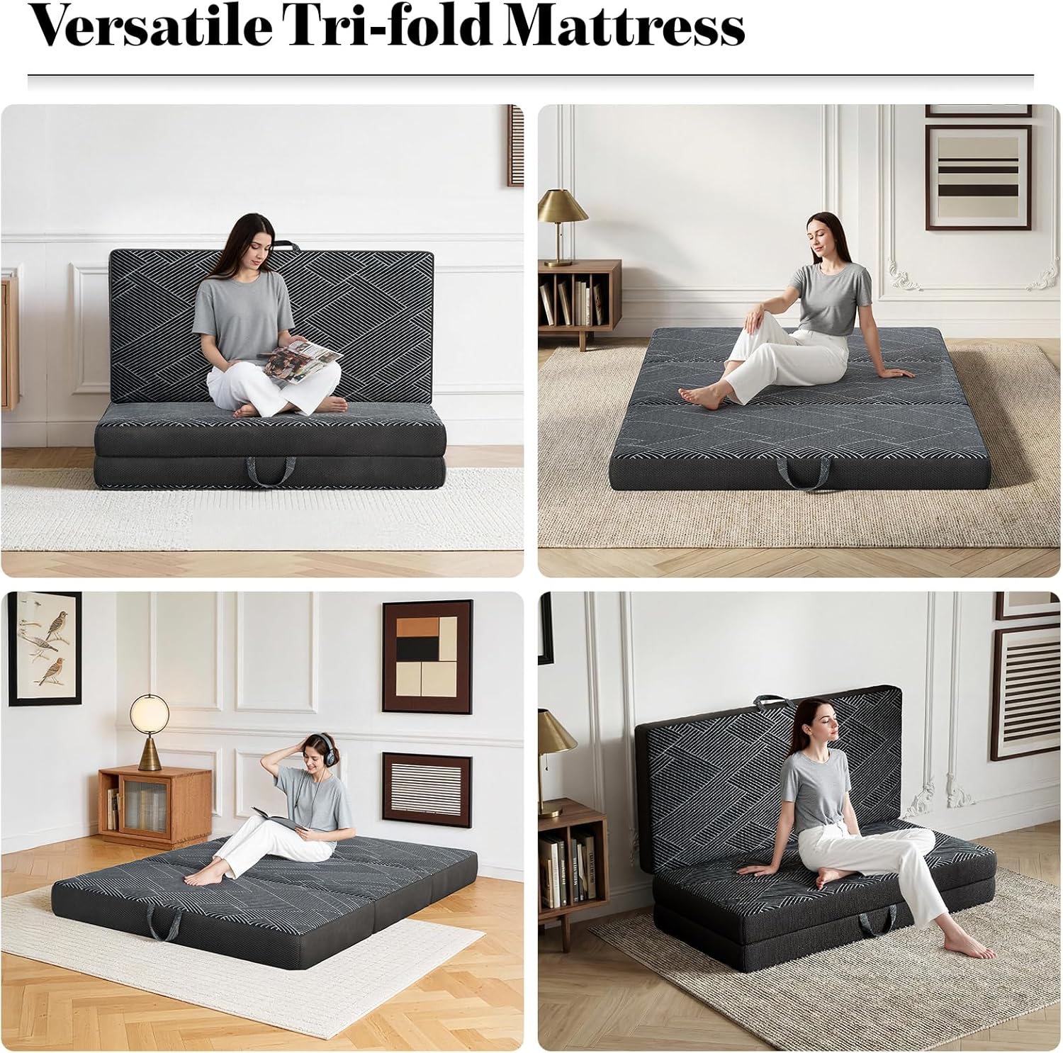 Versatile Foldable Mattress: The tri-fold mattress features a portable double-layer foam design, breathable knit fabric, and a non-slip bottom.It unfolds into a comfortable bed or sofa, ideal for guests, camping, travel, or floor use