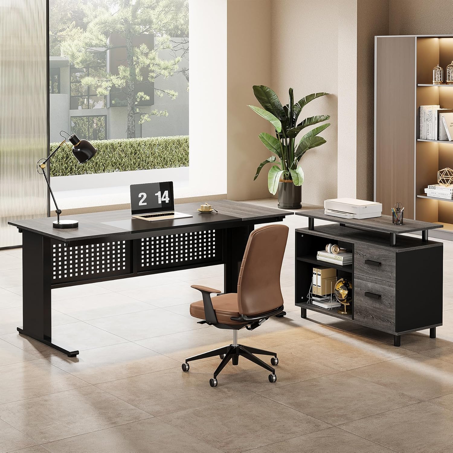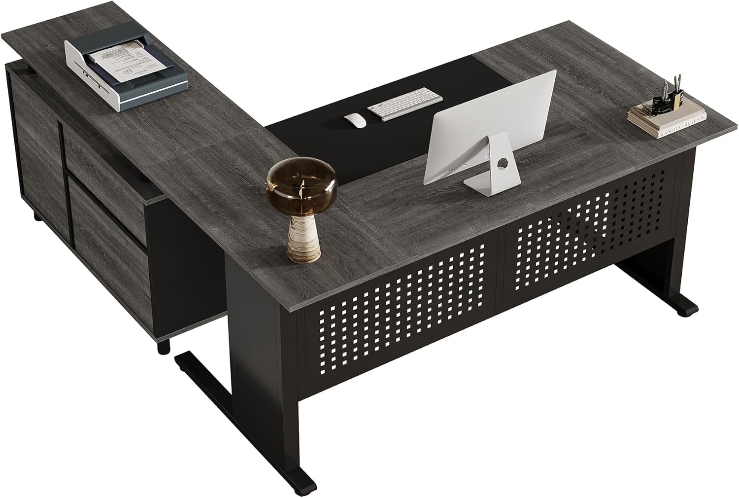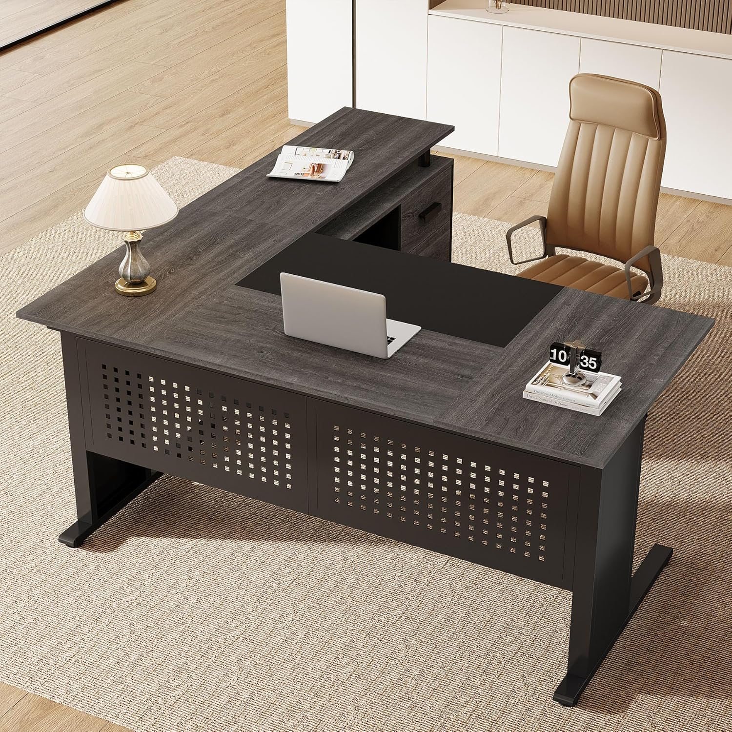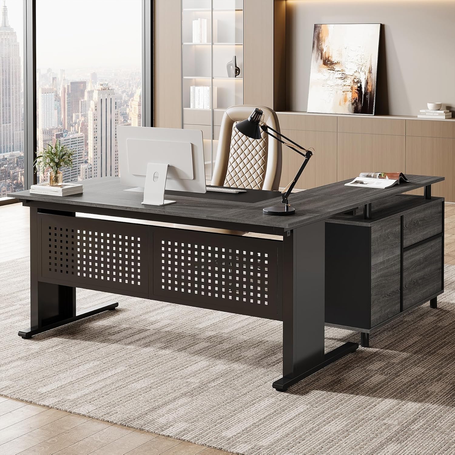 • 63-Inch L-Shaped Executive Desk with Storage Shelves, Large Office Computer Desk with Drawers and File Cabinet, Industrial Business Workstation for Home Office, Gray and Black