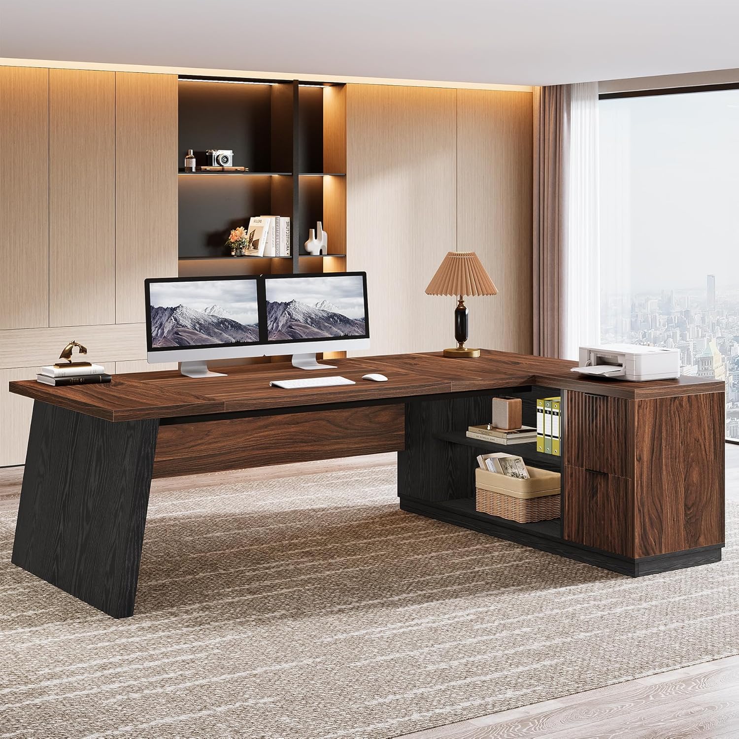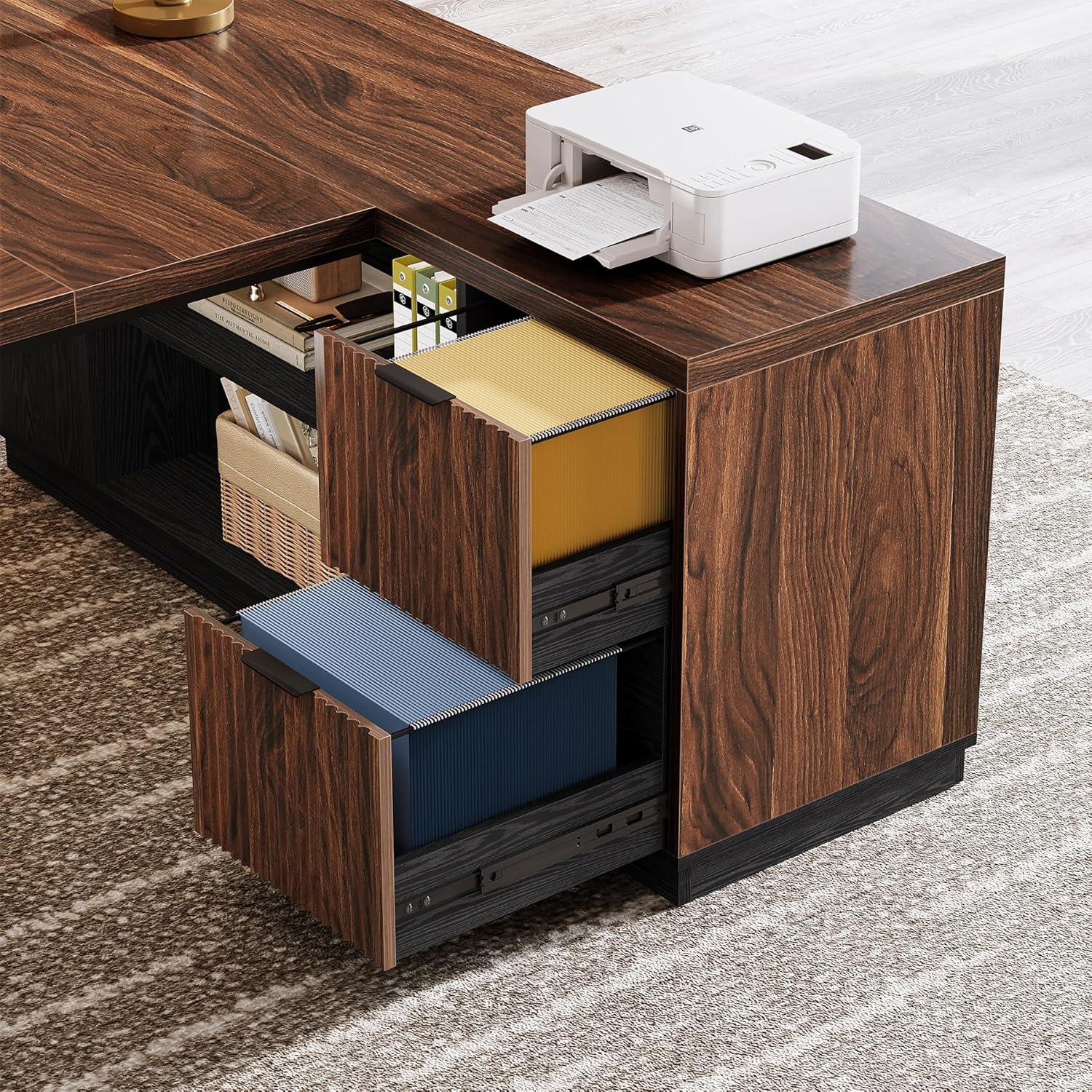 Smart Storage Solutions: Maximize efficiency with 2 drawers and two open shelves, offering ample space for printers, files, and office supplies to keep your L-shaped computer desk tidy
