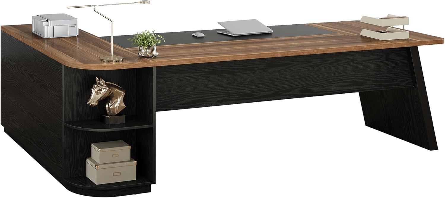 Exquisite Design: This L-shaped desk creates a striking contrast with its black and walnut veneers, achieving a look that is both refined and welcoming. Its industrial-style touches add a purposeful yet visually engaging aesthetic to your home office