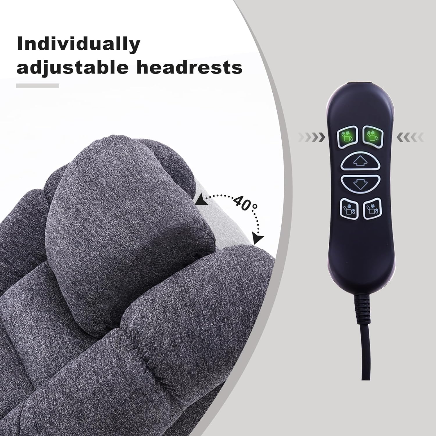 INDIVIDUAL ADJUSTABLE HEADREST: While adjustable headrests can be used for custom comfort while sitting upright, they are especially designed to allow someone who is reclined back to look forward such as toward the TV without straining the head or neck