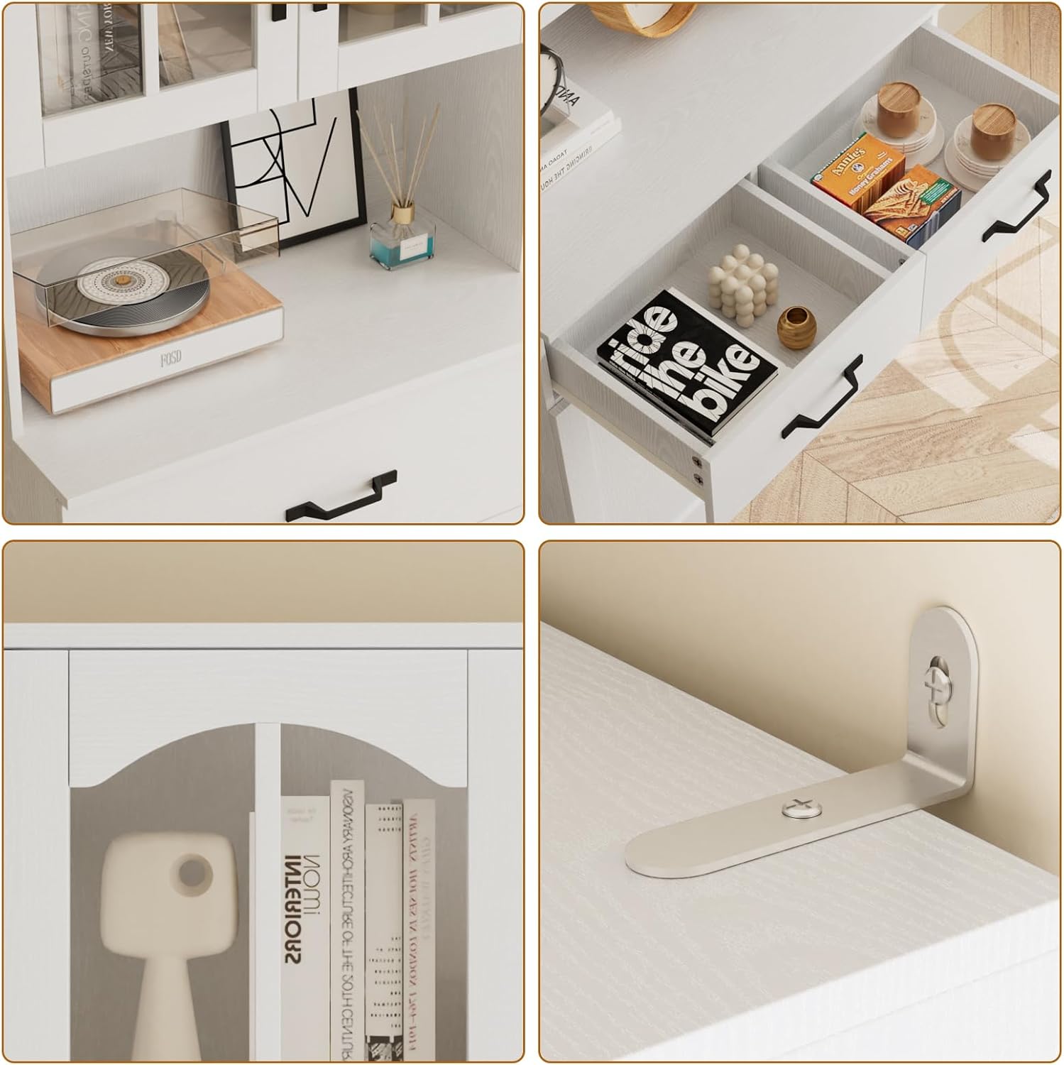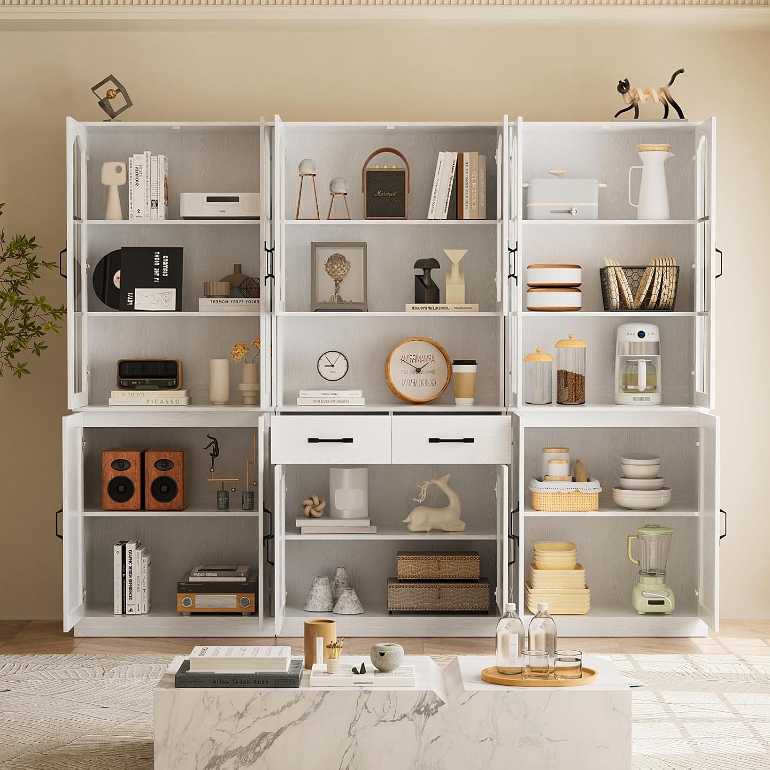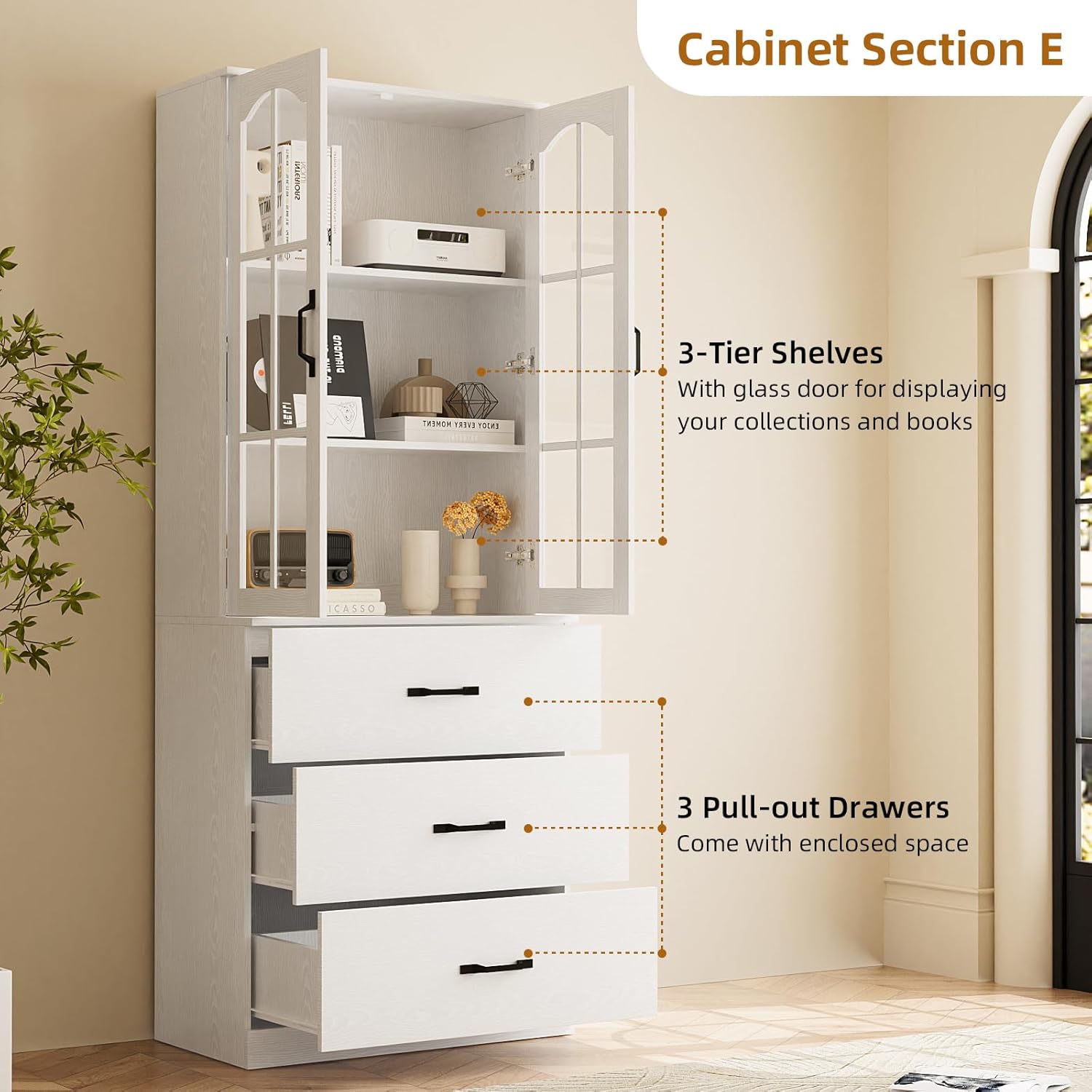 DIY Your Cabinets: Our 23.6" wide bookcases offer a flexible modular design with four core components: glass-door, wooden-door, console tops, and large drawers. that you can freely combine. More than just bookcases, they can be configured as filing cabinets or elegant sideboards to suit any room.