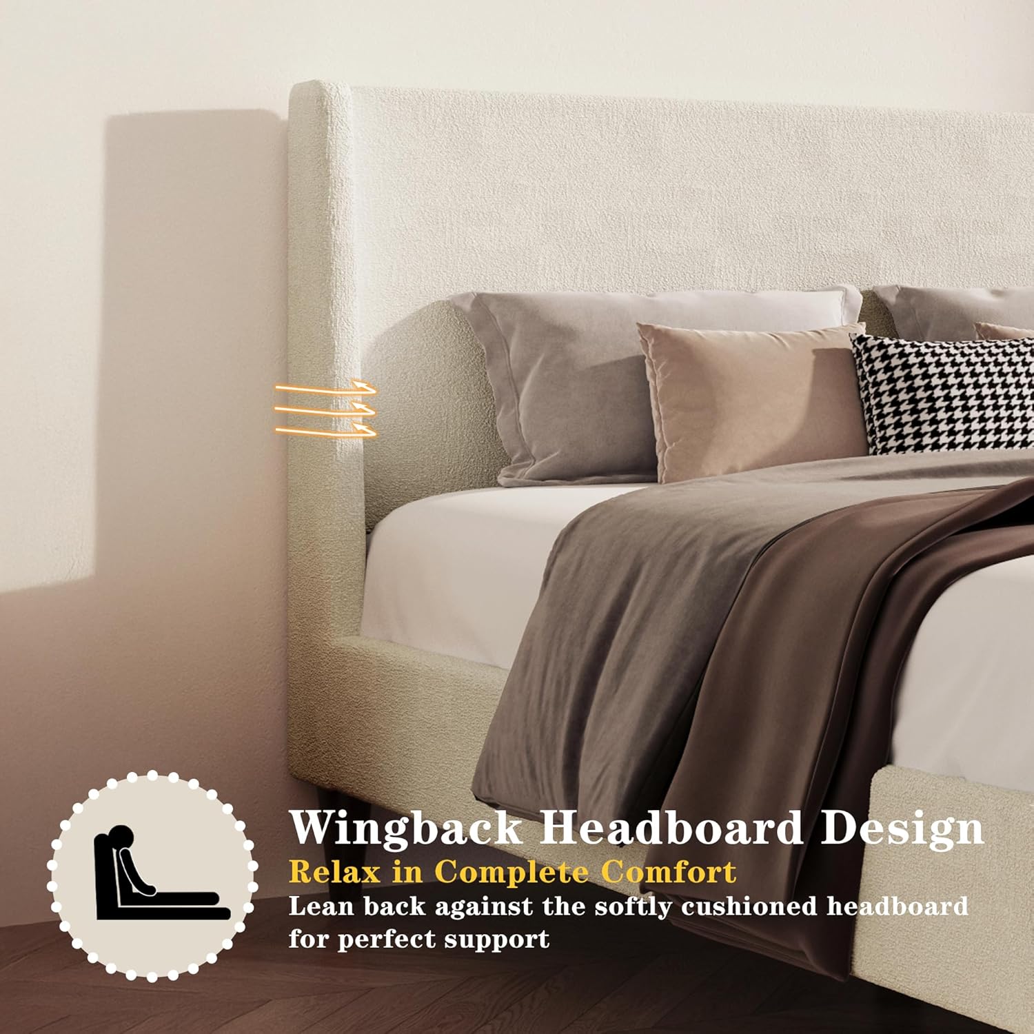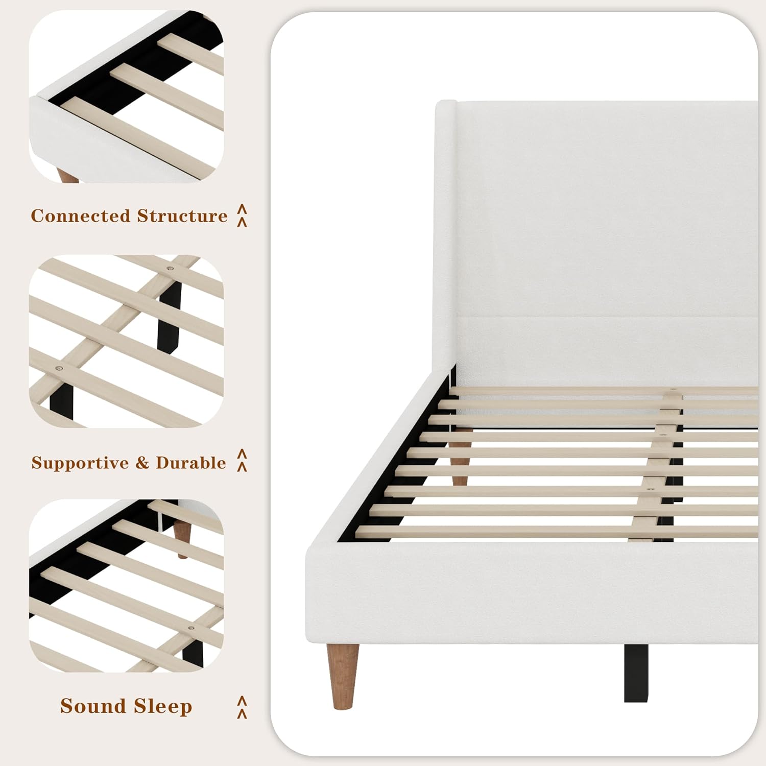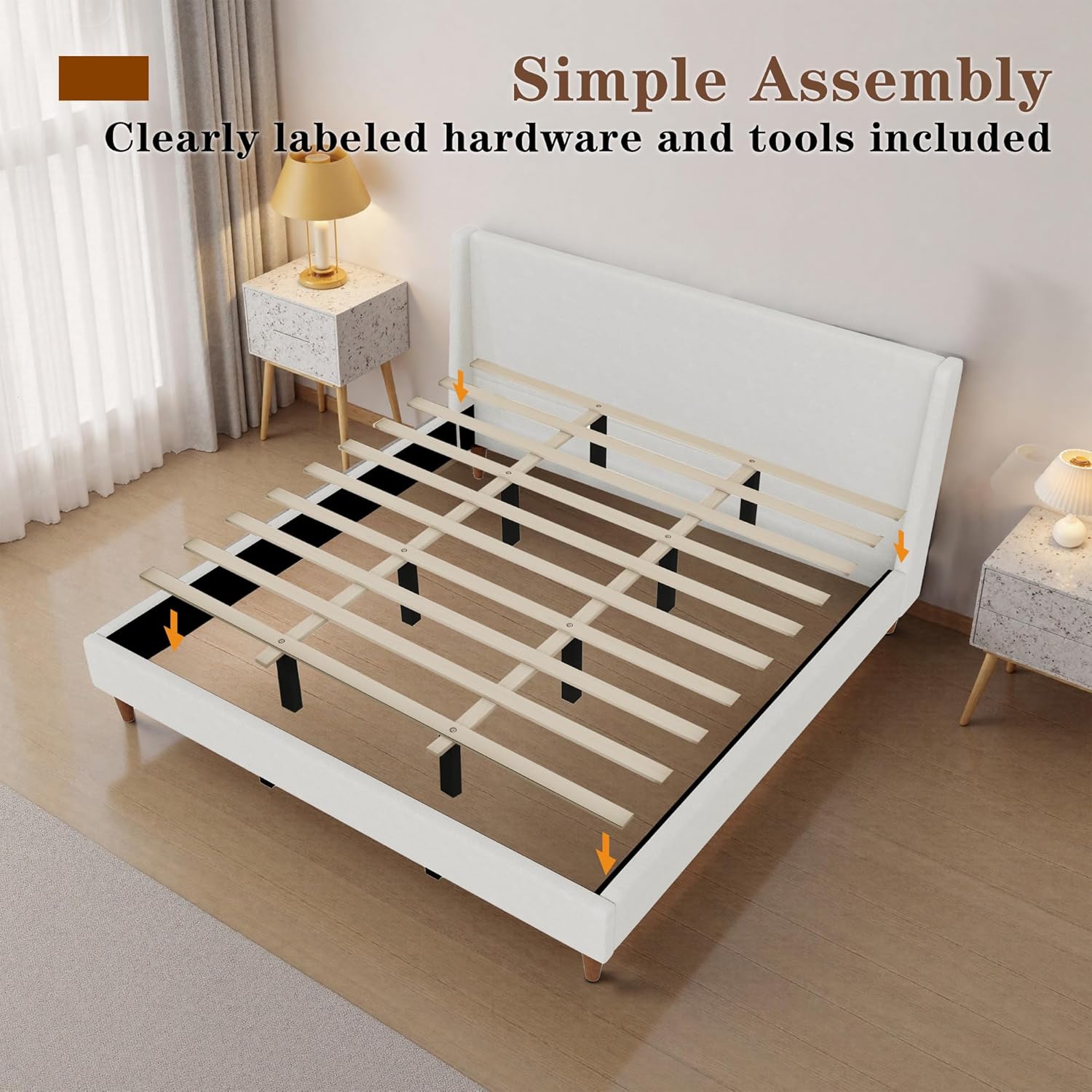 Durable & Sturdy Construction: Designed for comfort and long-lasting use, this upholstered queen bed frame with headboard boasts a solid metal construction with a wooden slats base that provides robust support. The metal side rails add further stability, ensuring your bed remains quiet and comfortable for years to come.