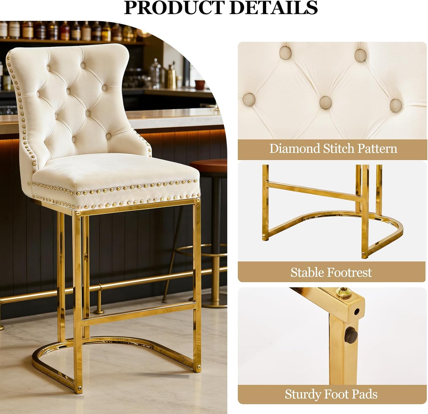 Ergonomic Bar Stools with Backrest: Designed for ultimate comfort, these bar height stools combine posture-supporting ergonomics with luxury details. The high-resilience foam seat and built-in footrest minimize fatigue during extended use, while the curved backrest aligns perfectly with your spine.