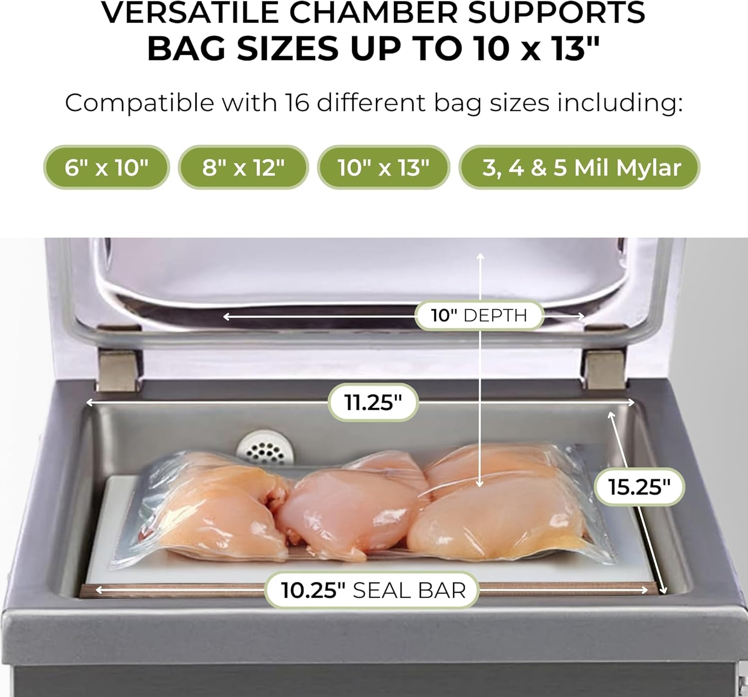Quality At Home and Reliable for Your Business - With the compact design this vacuum sealer is the perfect crossover for home and commercial use. Stands up to prolonged and continuous use that delivers a strong vacuum and seal every time. The small footprint makes it convenient for storage, transporting and will save countertop space while still maximizing your sealing capacity with a 10.25 chamber vacuum seal bar to accommodate a 10 x 13 bag for someone sealing large portions or food items