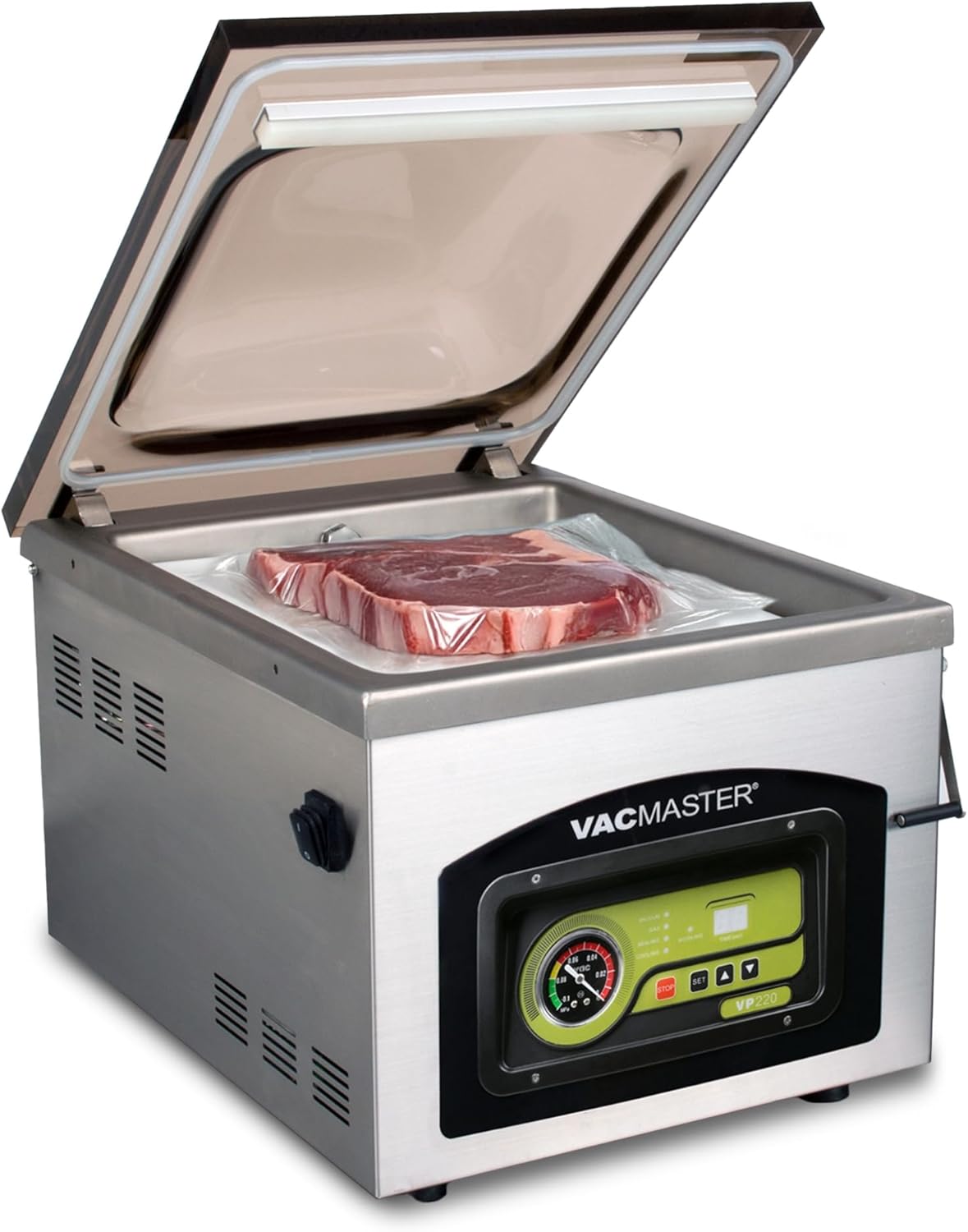 VP220 Specifications - Overall Dimensions (WxDxH): 15.5 x 19 x 15.75 | Chamber Size (WxDxH): 12.5 x 15 x 5 | Seal Bar Size 12.25 | Maximum Bag Size 12 x 15 | Pump: Maintenance-Free Air Pump |Weight: 82 lbs.