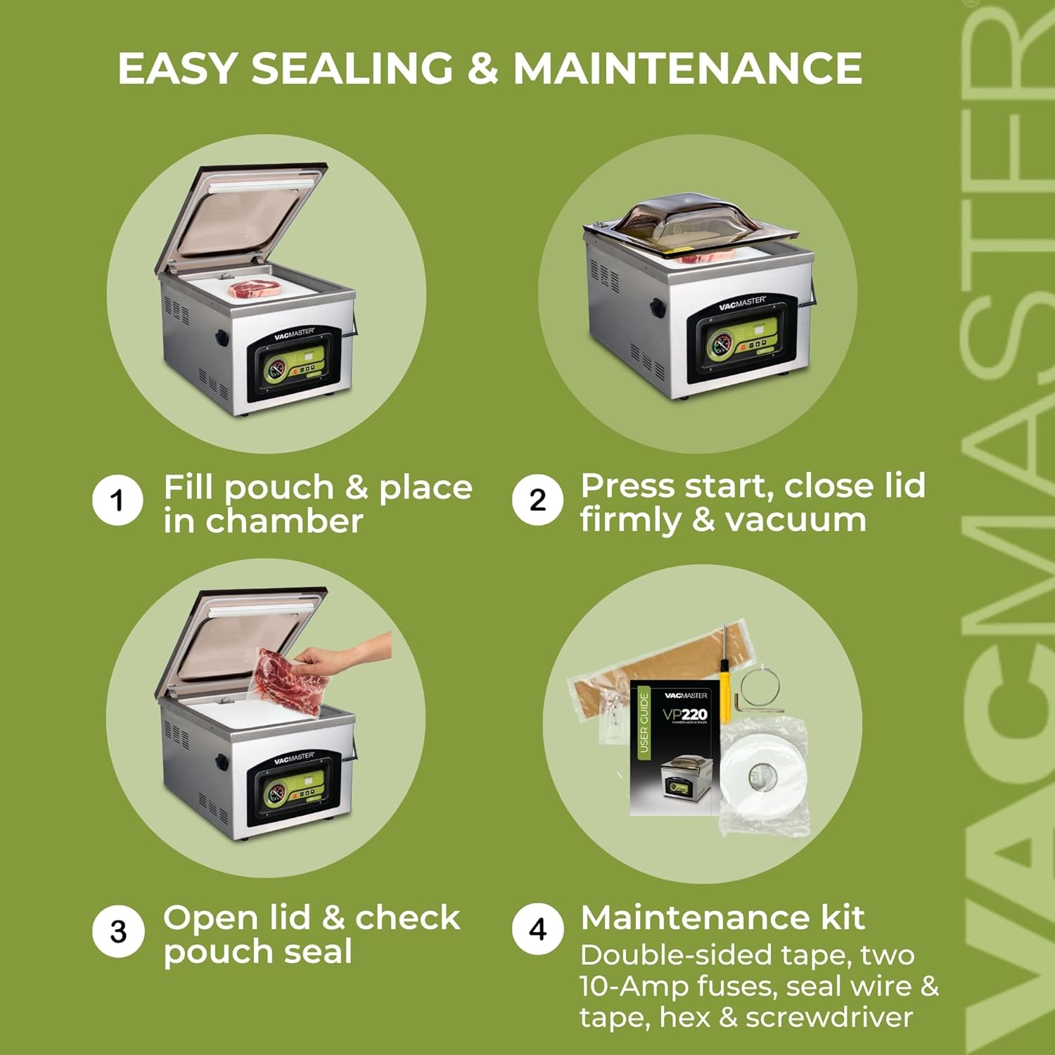 Vacuum Sealing Capabilities - VP220 can double seal a wide variety of bags which include 3 MIL, 4 MIL, 5 MIL, as well as 5 MIL and 7 MIL mylar bags. This chamber vacuum sealer is great for portioning, sous vide, and storage in the freezer.