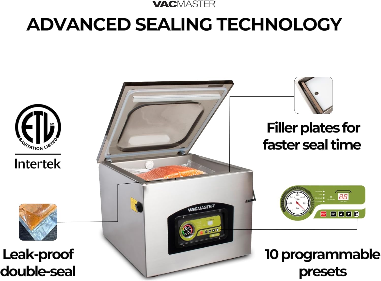 EASY-TO-USE LED CONTROL PANEL: Achieve consistent vacuum and seal every time with a user-friendly digital control panel, pressure indicator readout, and 10 programmable vacuum and seal time cycles.