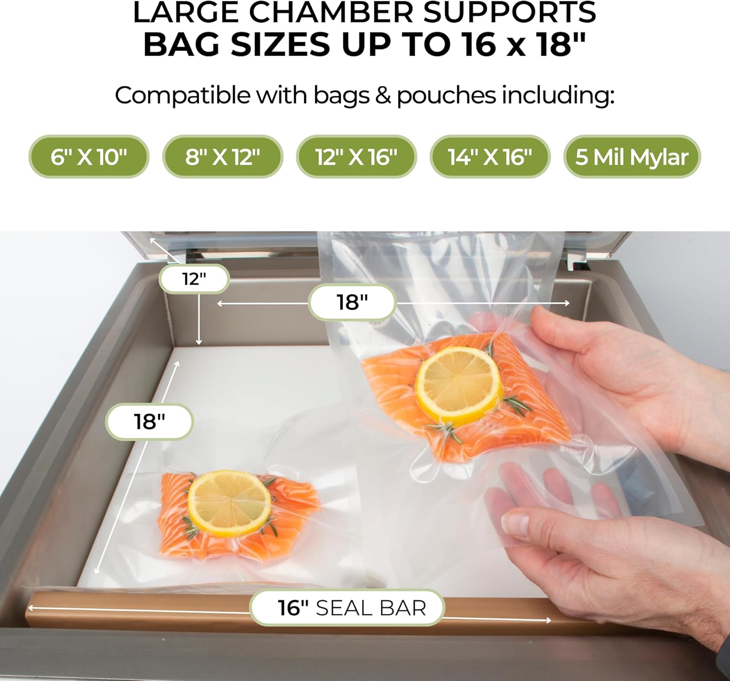 COMPATIBLE WITH BAGS UP TO 16"x18": The chamber vacuum sealer works with bags up to 16"x18", including Mylar, zippered, flat, vacuum chamber pouches, and more.