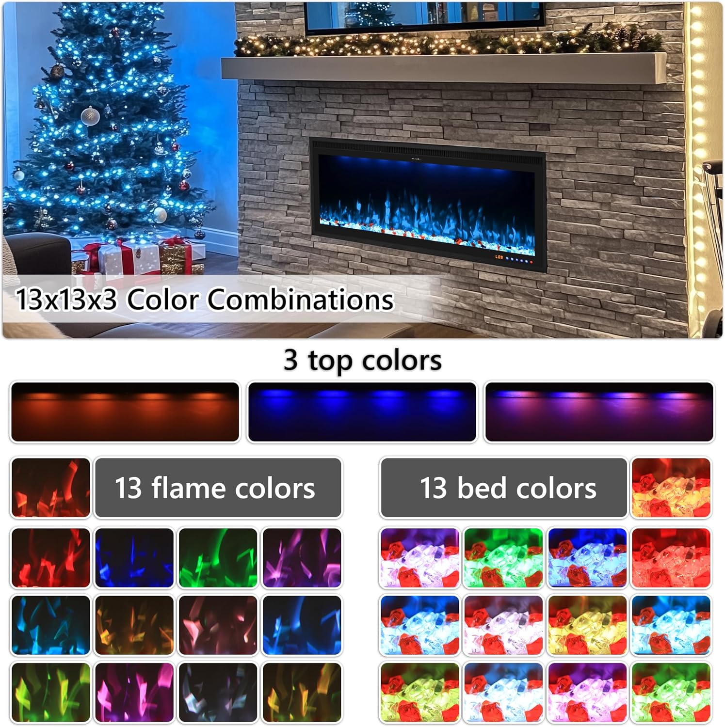 Features of electric fireplace heater: Up to total 507 color combinations.13 flame colors, 13 bed ember colors,3 top light colors. It can meet your needs in almost any situation. Crystal and logs decorations are freely to be putted in fireplace wall mounted or built in wall. Flame and lights can be shown without heating