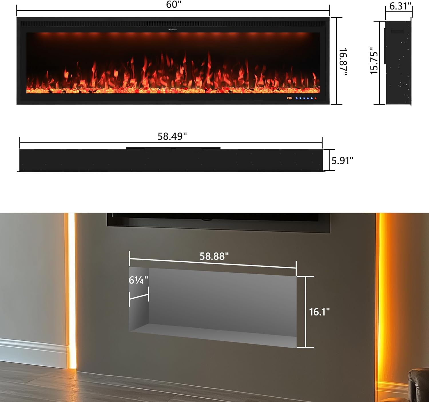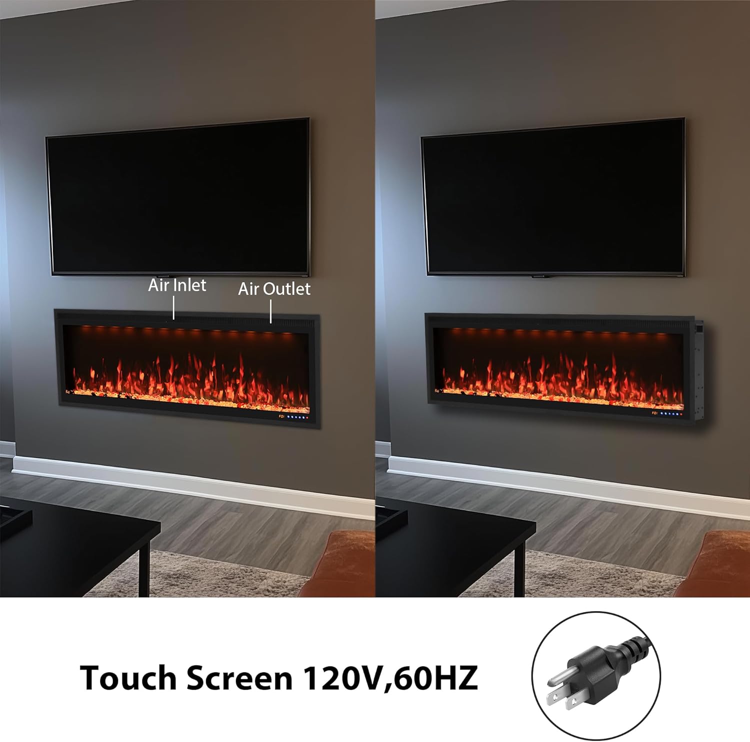 Two Heating Modes: Choose the High temperature (1500W) with hot air or Low temperature (750W) with warm air freely. Heating for 400 sq ft. Flame, light color and heating function are all independently controlled. This built-in and wall mounted electric fireplace can be worked without flame and lights