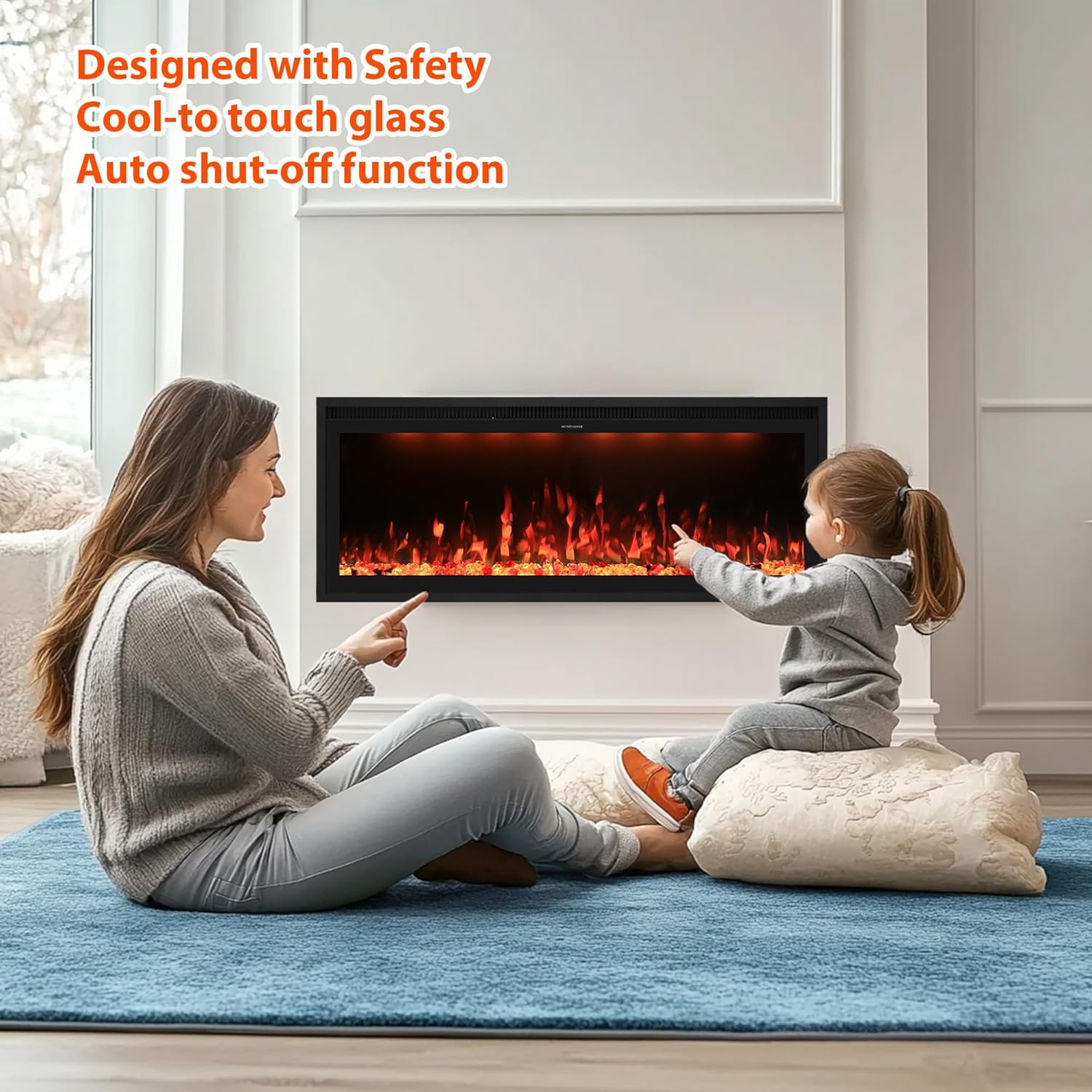 Multiple control modes: App control, Touch screen and remote control . Of course you will find more ways when using this modern electric fireplace heater