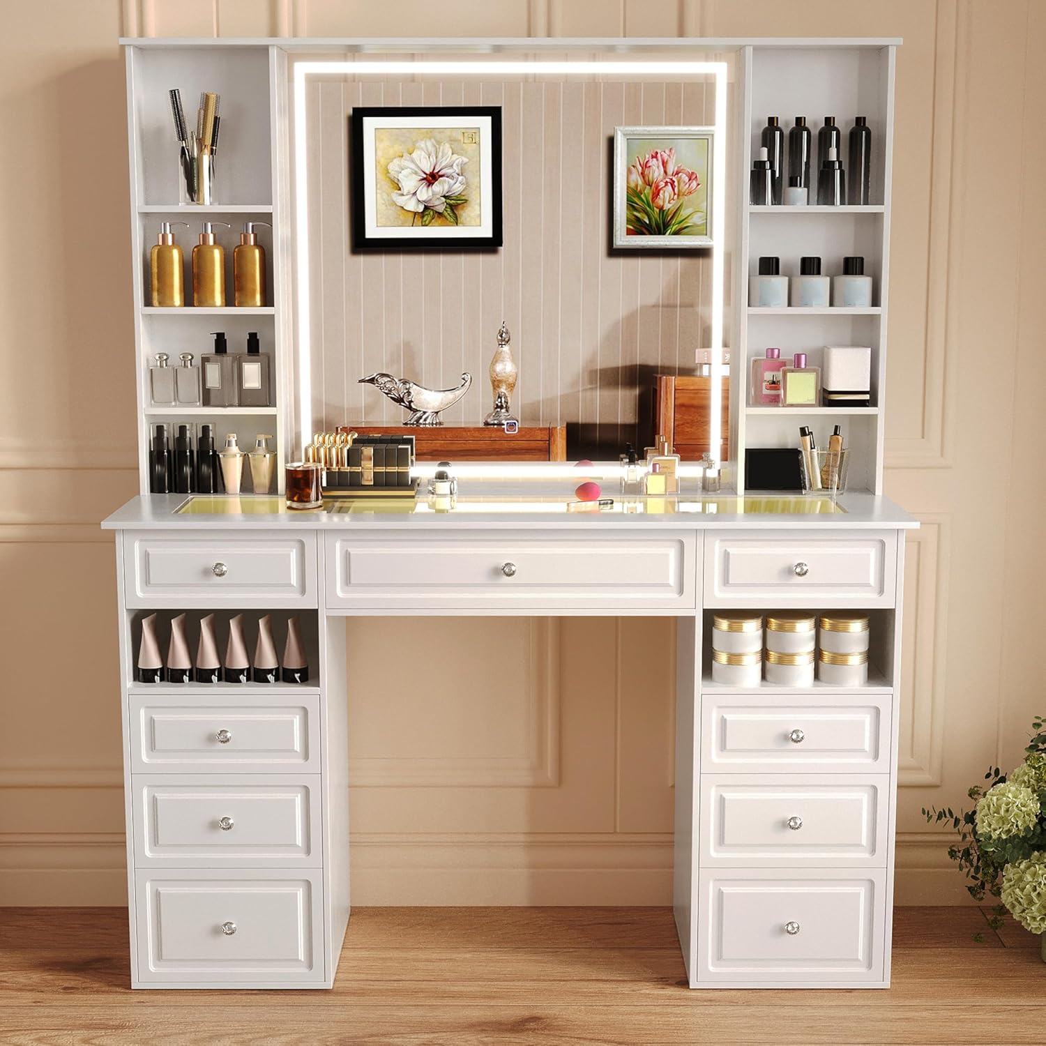 Storage Master The vanity desk with 9 drawers,Two hollowed out storage spaces allow you to easily place various commonly used items such as curling sticks and hair dryersEasily organize your makeup, jewelry and other accessories. Also, The dresser table top also has plenty of space for your computer or other office supplies. Save money and space, make your daily routine more perfer.