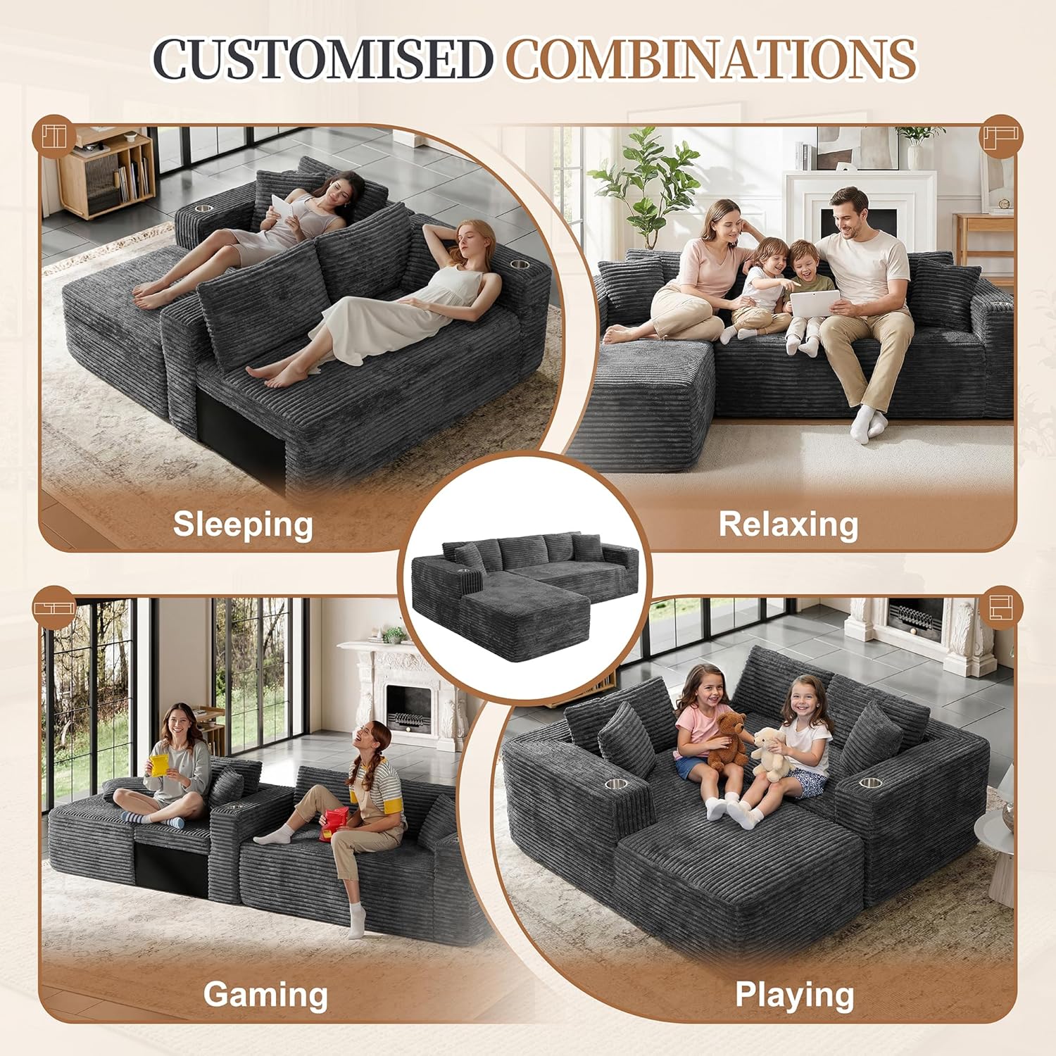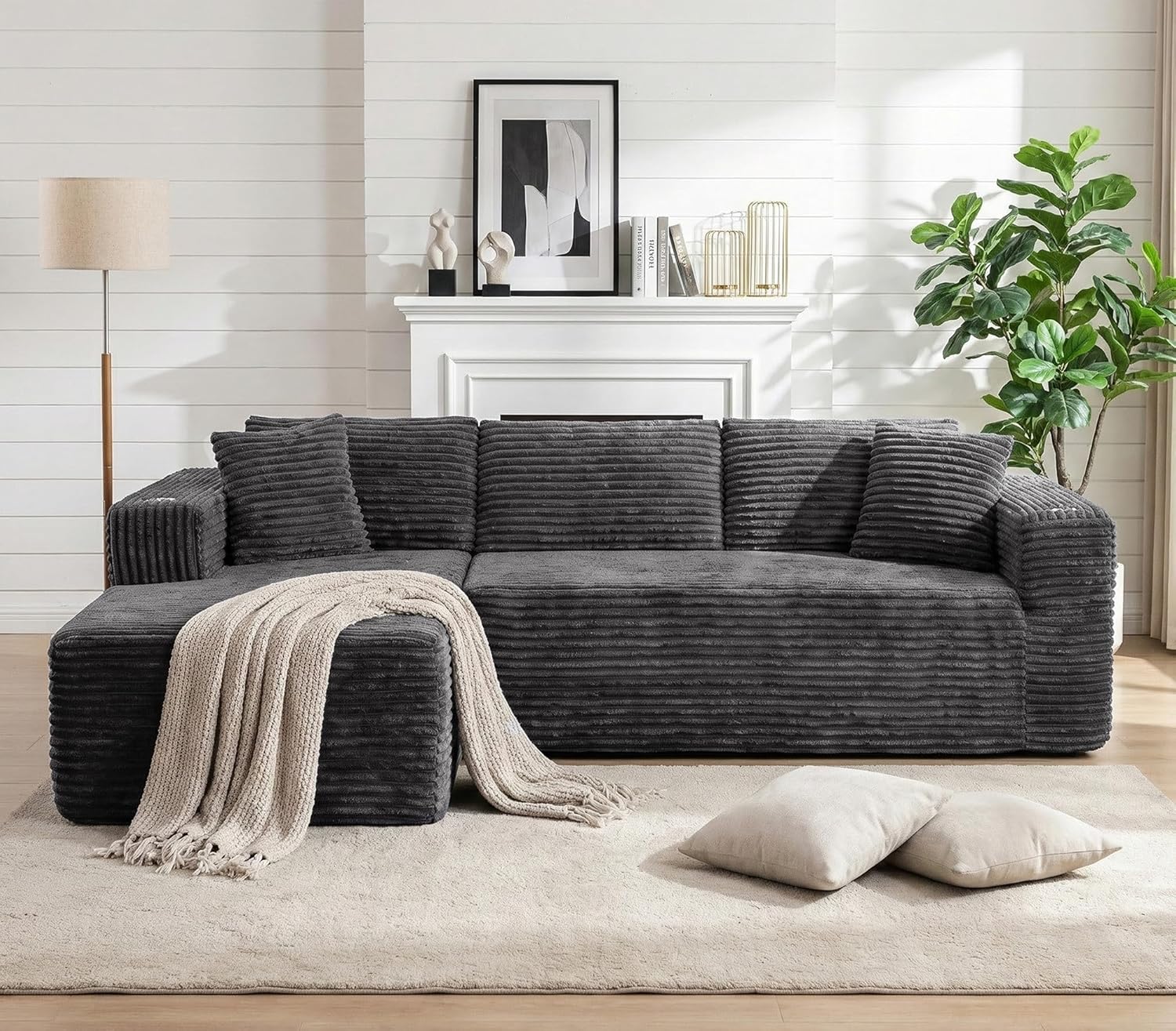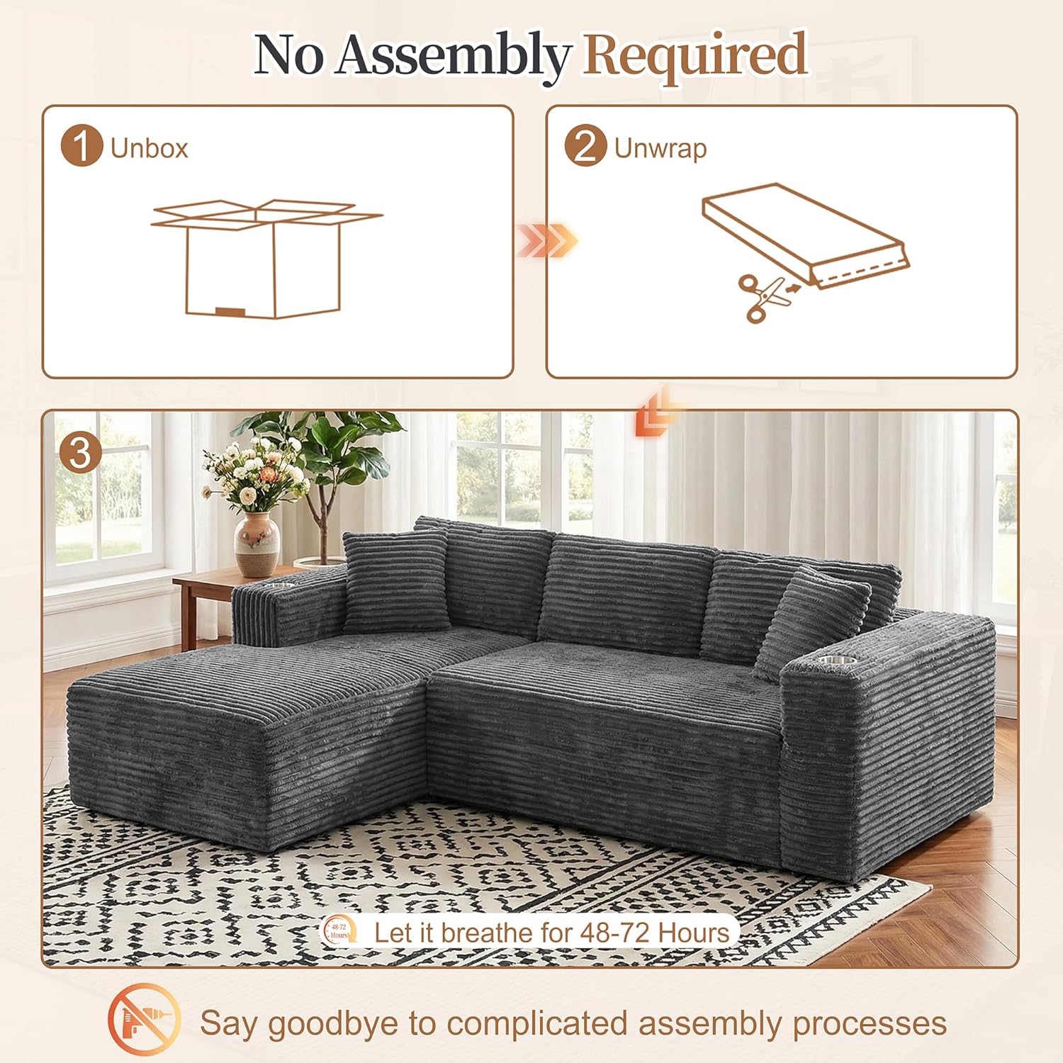 • 103" Boneless Couches for Living Room,Sectional Couches Modular Sofa with L-Shaped Chaise, Memory Foam Comfy Cloud Couch with Plush Corduroy Fabric, No Assembly Required, Dark Grey