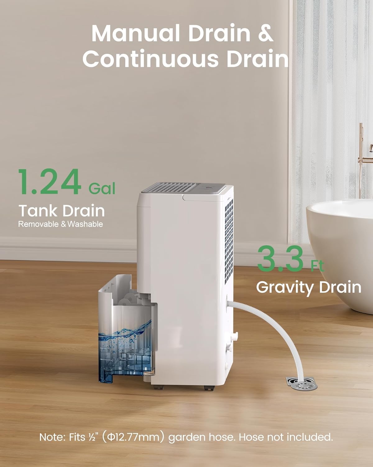Hassle-Free Drainage & Easy-to-MoveEquipped with a 1.24-gallon see-through tank and auto shut-off, plus a 3.3-ft drain hose for continuous drainage, this dehumidifier makes moisture removal simple and stress-free. Built-in auto defrost and overflow protection ensure safe, reliable operation. With 360 swivel wheels and a built-in handle, it rolls easily between the basement, bathroom, laundry room, or any space that needs itdry air, right where you want it.