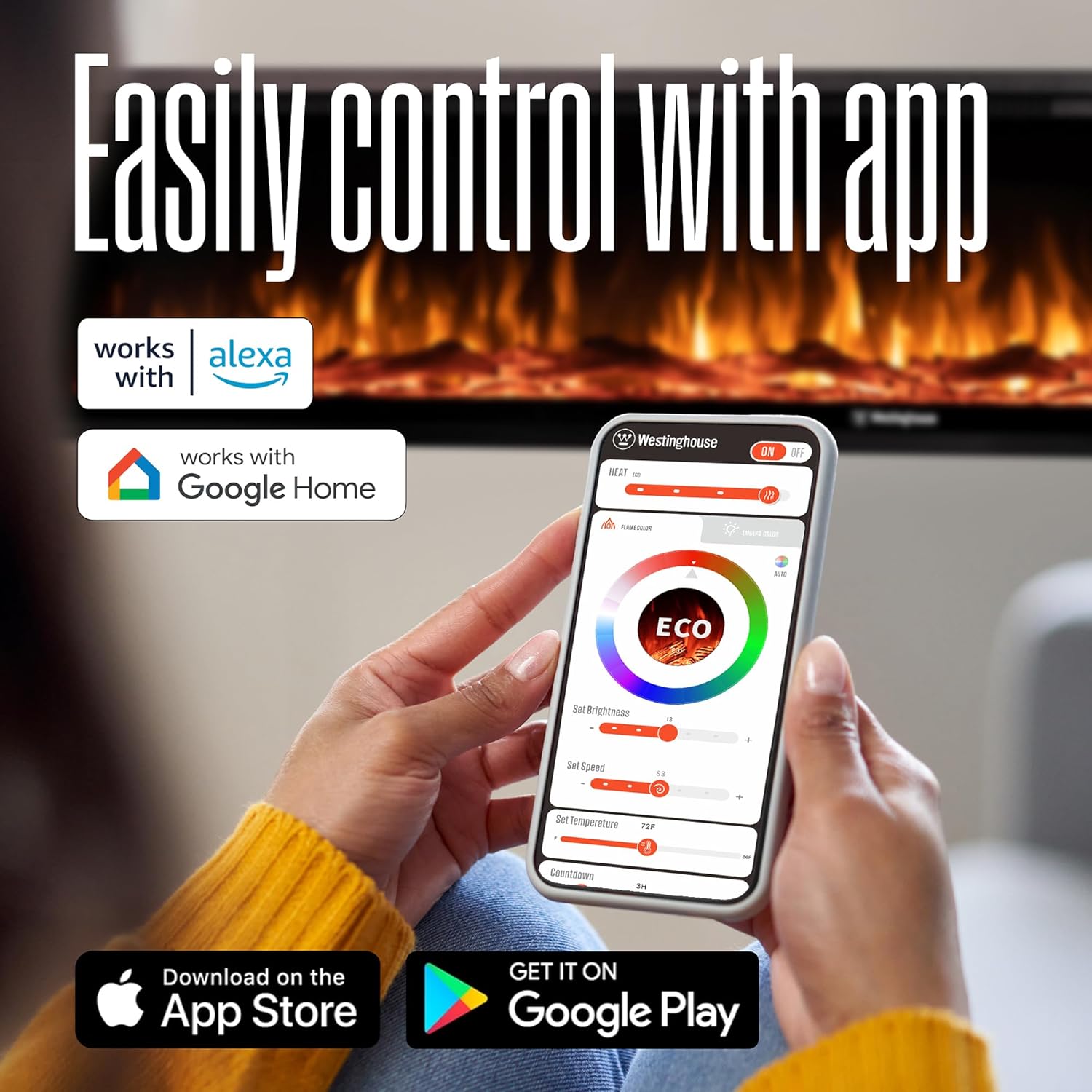 MULTIPLE CONTROL MODES: Compatible with Alexa and Google Home to elevate your smart home experience. The electric fireplace can also be controlled using the app and the included remote.