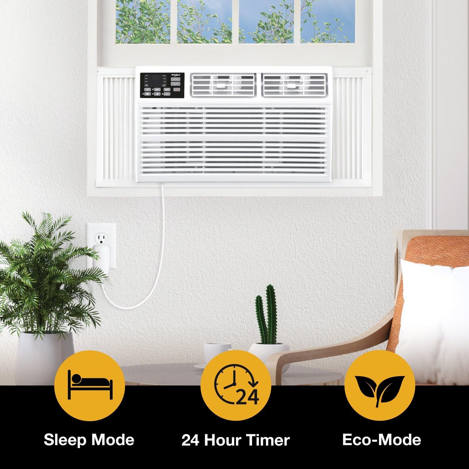 Functionality: The window unit features an electronic control panel with digital display and 3 cooling speeds, eco mode, sleep mode, and a programmable 24 hour on/off timer with 8-way directional air louvers; Remote control included for easy control