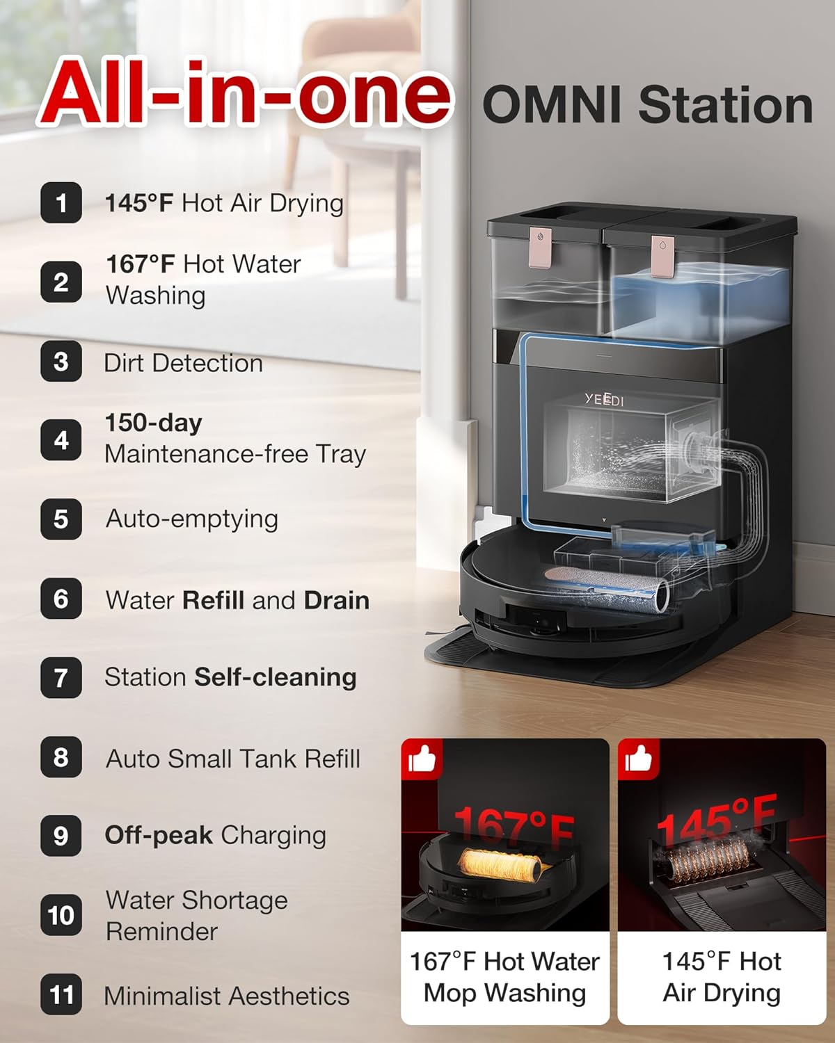 OMNI Smart StationCleaning Maintenance Made Effortless - Let the OMNI Station handle the hard work: it washes your mop with steaming 167 water, dries it at 145, empties dust automatically, and refills waterso you can spend less time cleaning and more time living, with all maintenance visible and simple.