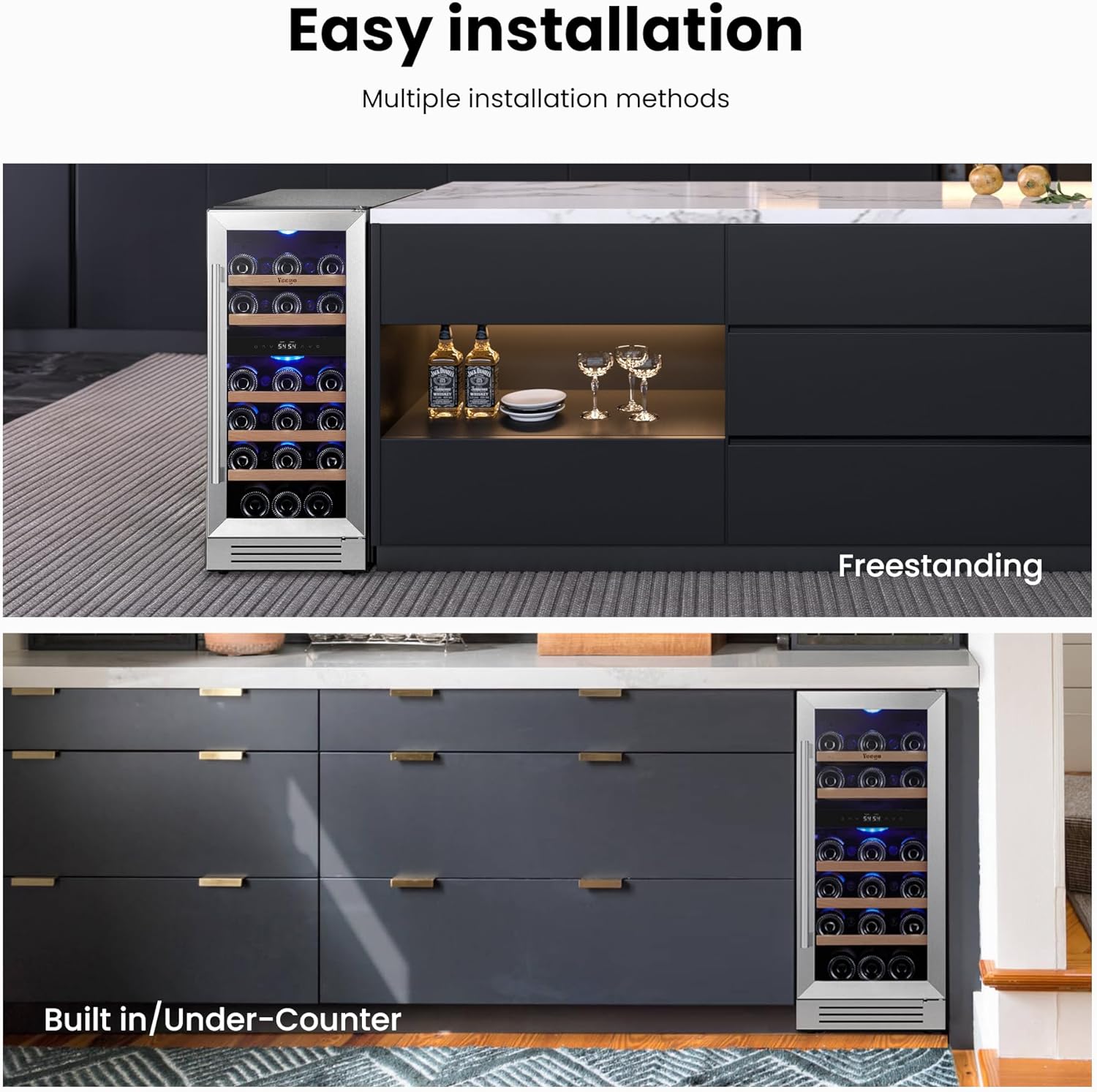 User-Friendly Design and Product SupportThis wine refrigerator has a upgraded front grille for optimal air flow and safety, preventing children from touching vents. At 14.8 W x 22.4 D x 34 H, it's easy to use for everyone, including those with disabilities. An adjustable door handle allow flexible door positioning to suit your needs. Plus, our support team is available 24/7 for installation and troubleshooting.