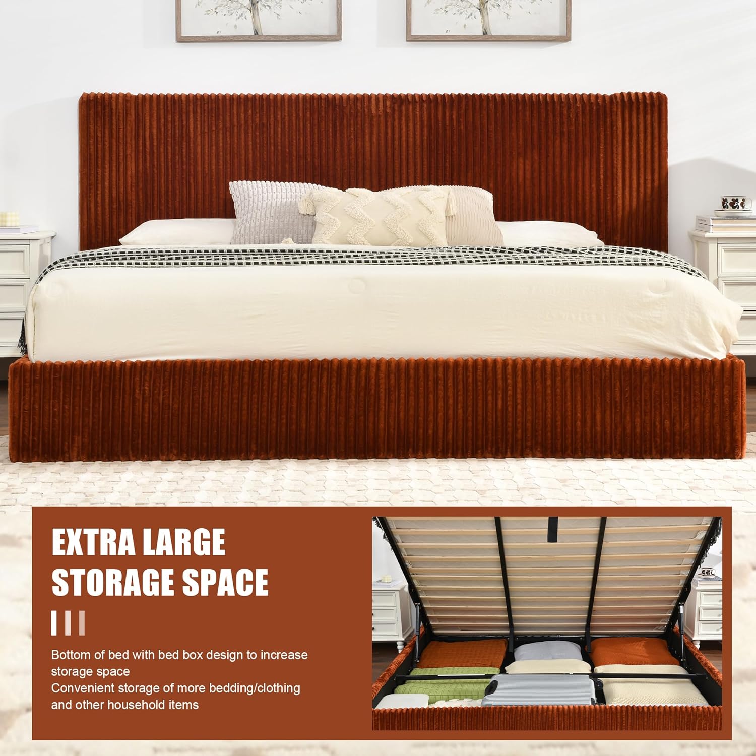 Hydraulic Lift StorageUsing the hydraulic lift system, the mattress can be easily raised to reveal a spacious storage compartment. This hidden space provides ample room for bedding, seasonal items or other necessities. Features a fall prevention device to prevent the mattress from slipping. The removable dust cloth on the bottom ensures that your stored items remain clean and dust-free.