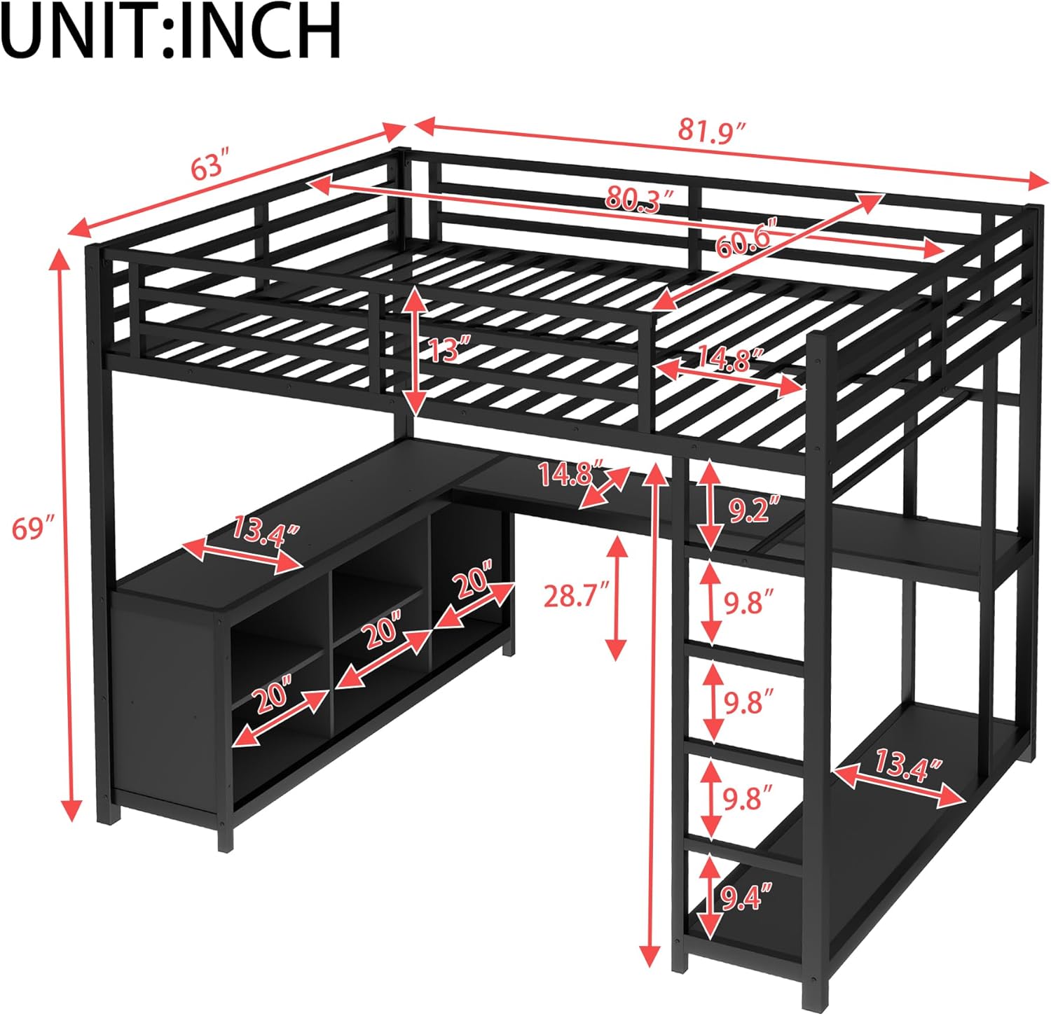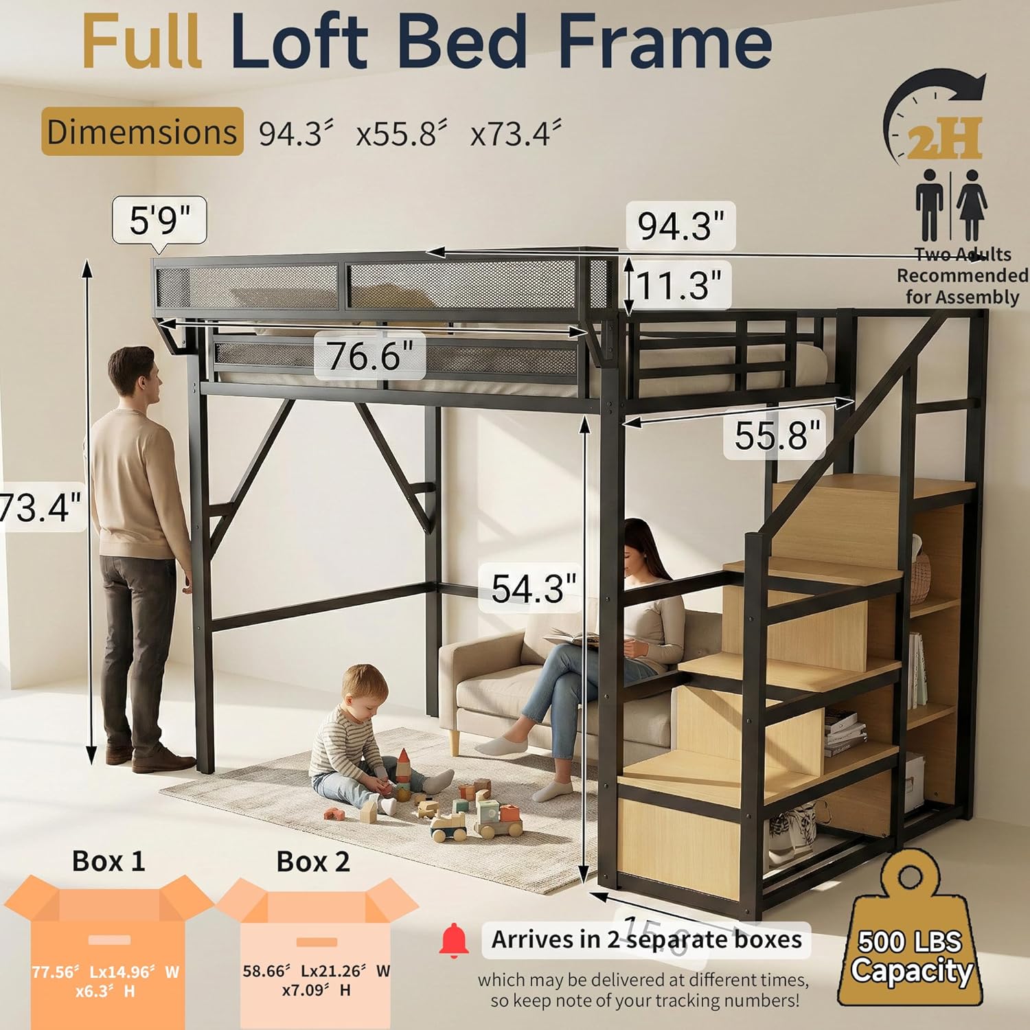 Full Size Loft Bed with Stairs and Storage, Metal Loft Bed Frame with Bedside Shelf and Large Under-Bed Space, Heavy-Duty Bed for Adults Teens and Kids, Convertible Staircase, Black