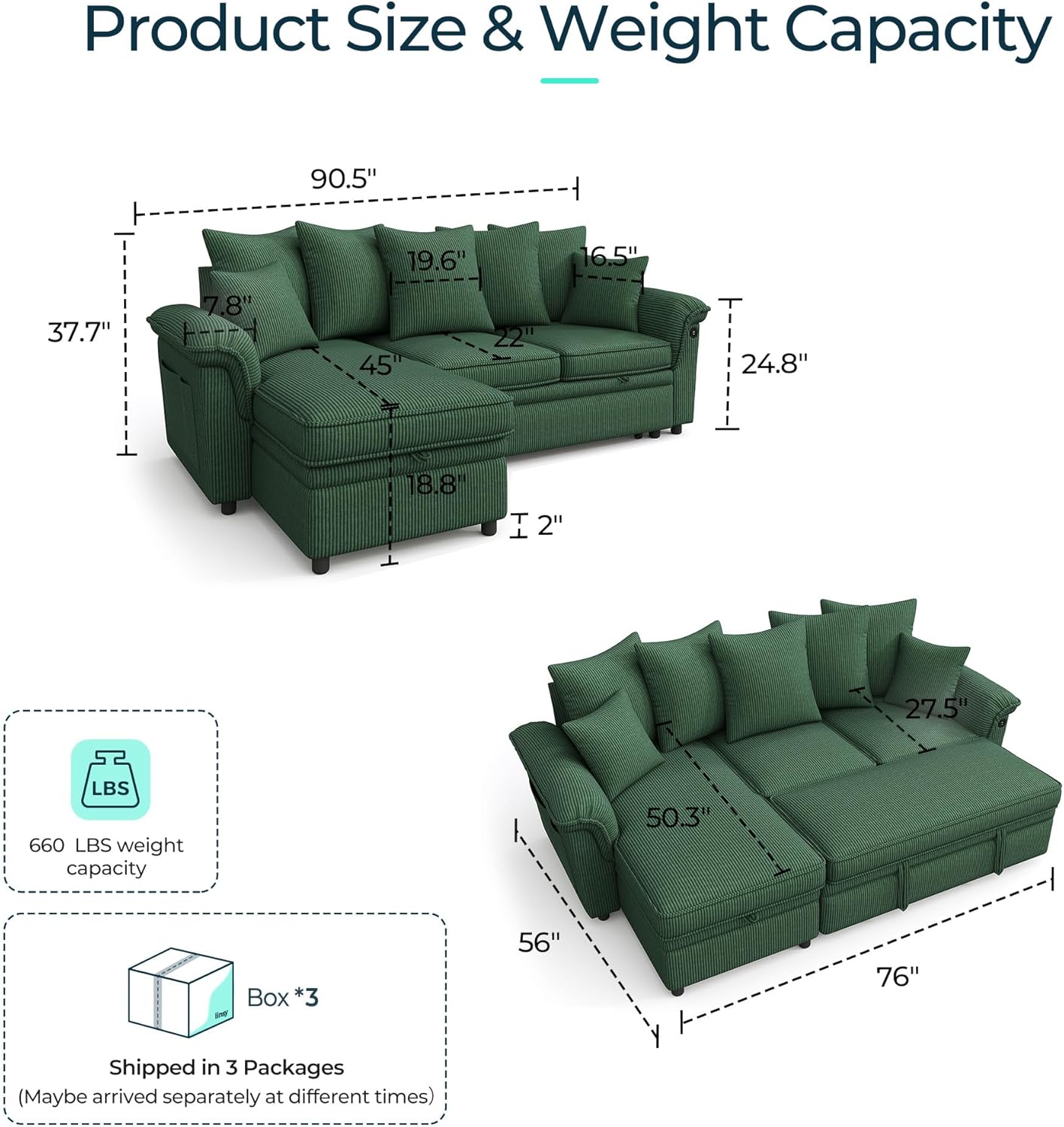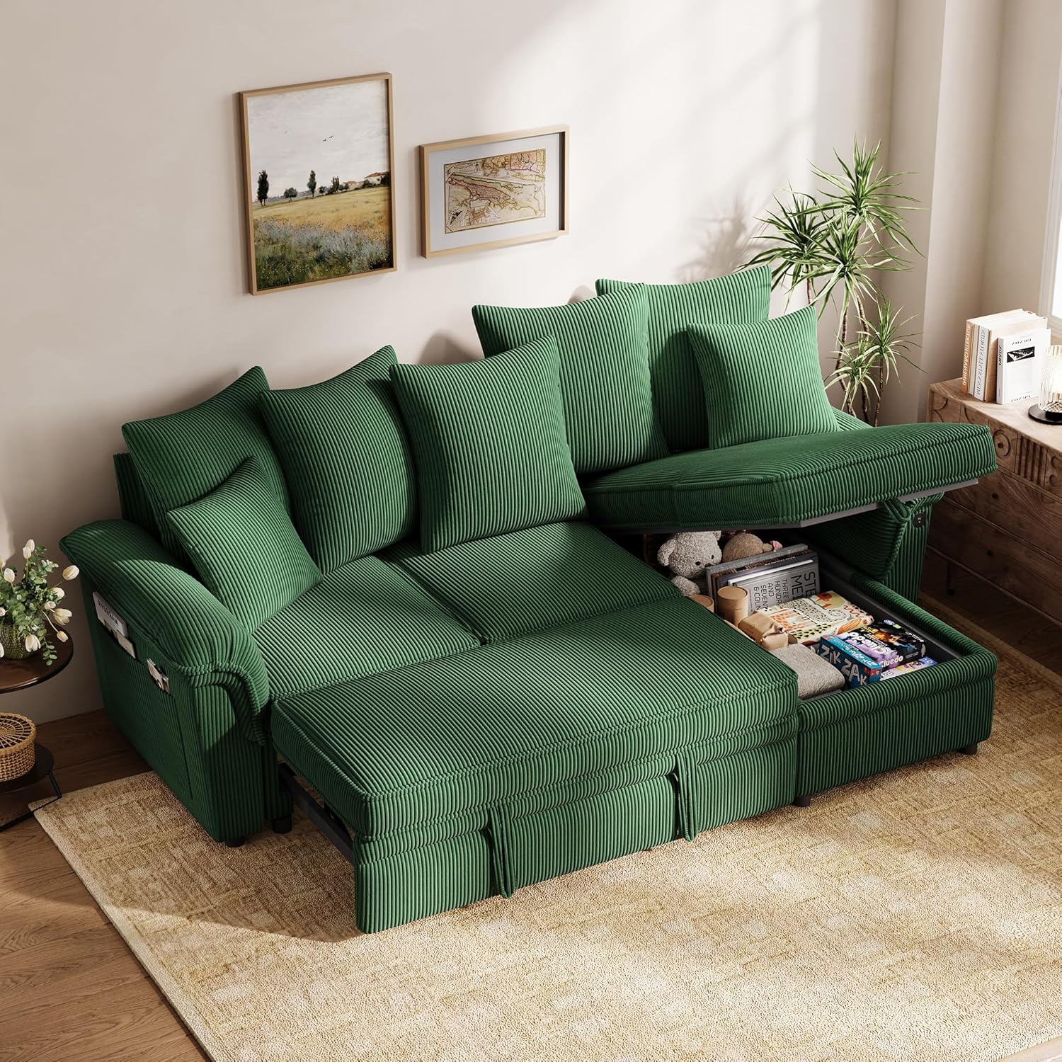 90.5'' Sectional Sleeper Sofa with Pull Out Couch Bed Modular (Green, 90.5'') | USB Charging, Pillow-style Armrest, Multiple Cushions, Storage Chaise, Corduroy Fabric