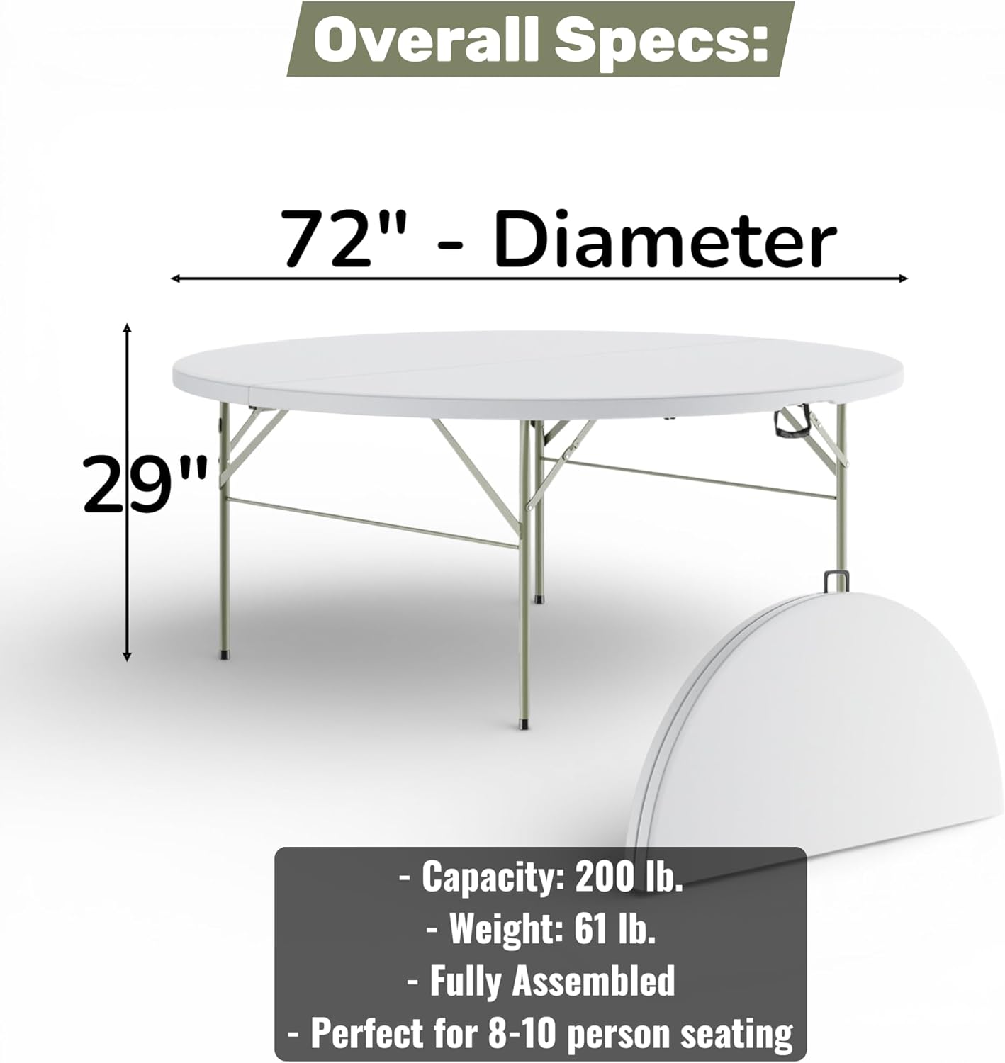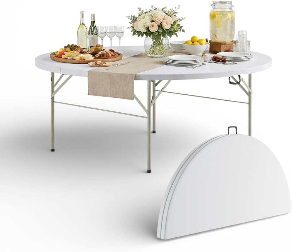 6 Ft Round Bi-Fold Folding Table with Carry Handle, 72" Bi-fold Table, Portable Plastic Table with Steel Legs for Party, Dining, Wedding, Events, Picnic, Indoor Outdoor Use