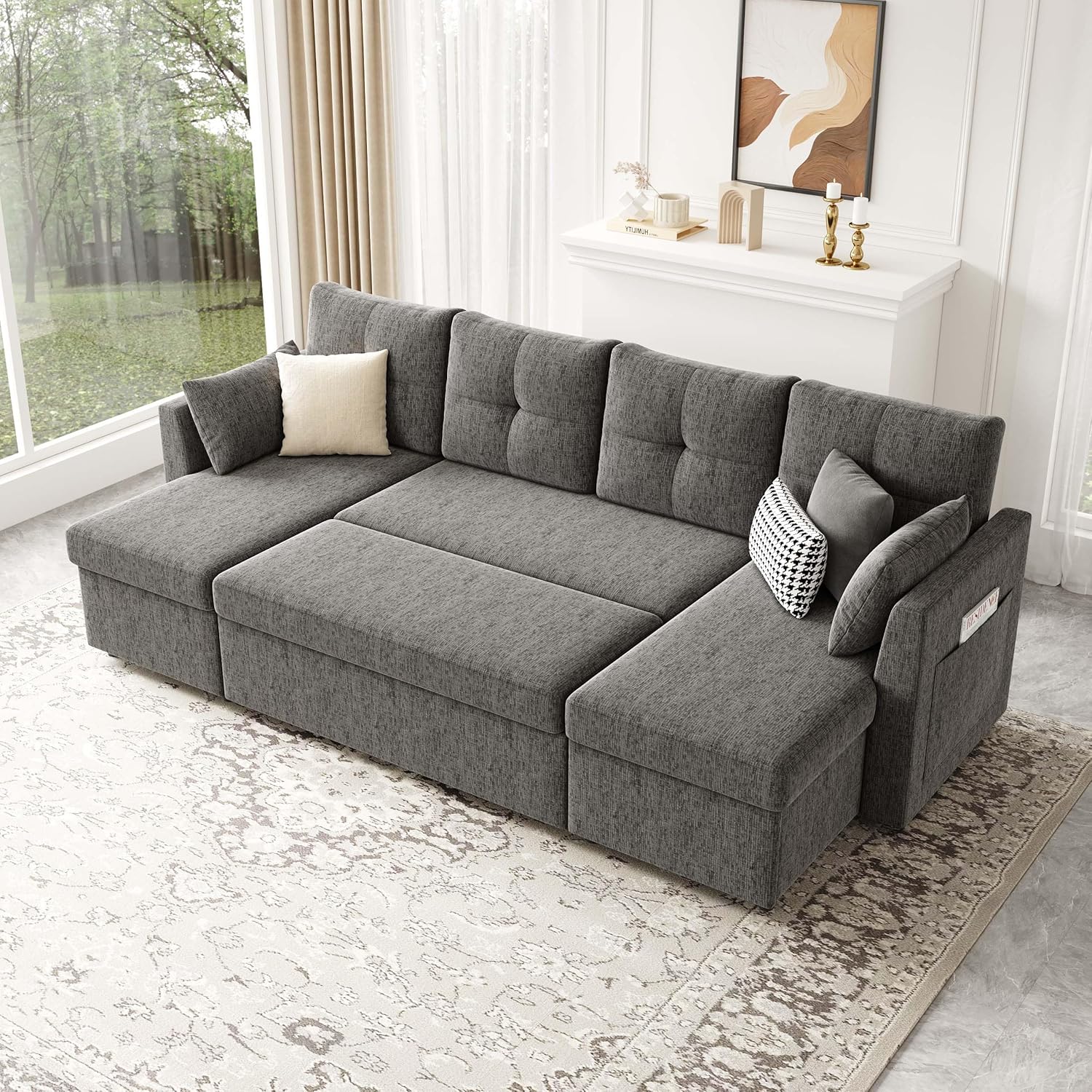 Oversized Sleeper Couch Sofa, 110 inch 2 in 1 Pull Out Couch with Double Storage Chaise, Sectional Sleeper Sofa Bed with Side Pocket for Living Room, Dark Grey