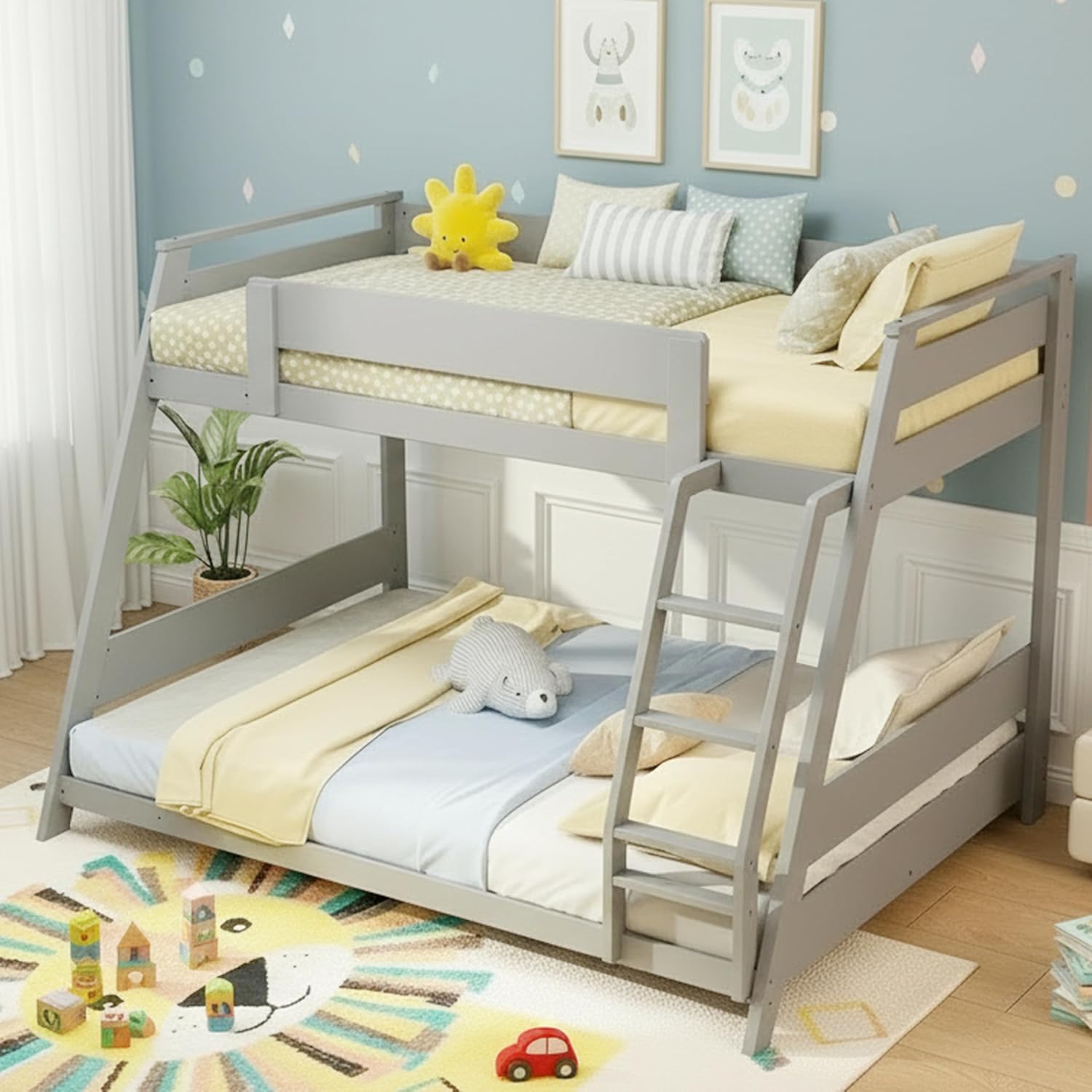 Twin Over Full Convertible Bunk Bed with Reversible Ladder, Solid Wood Frame, Slats Support & Guardrails, No Box Spring Needed (Grey)