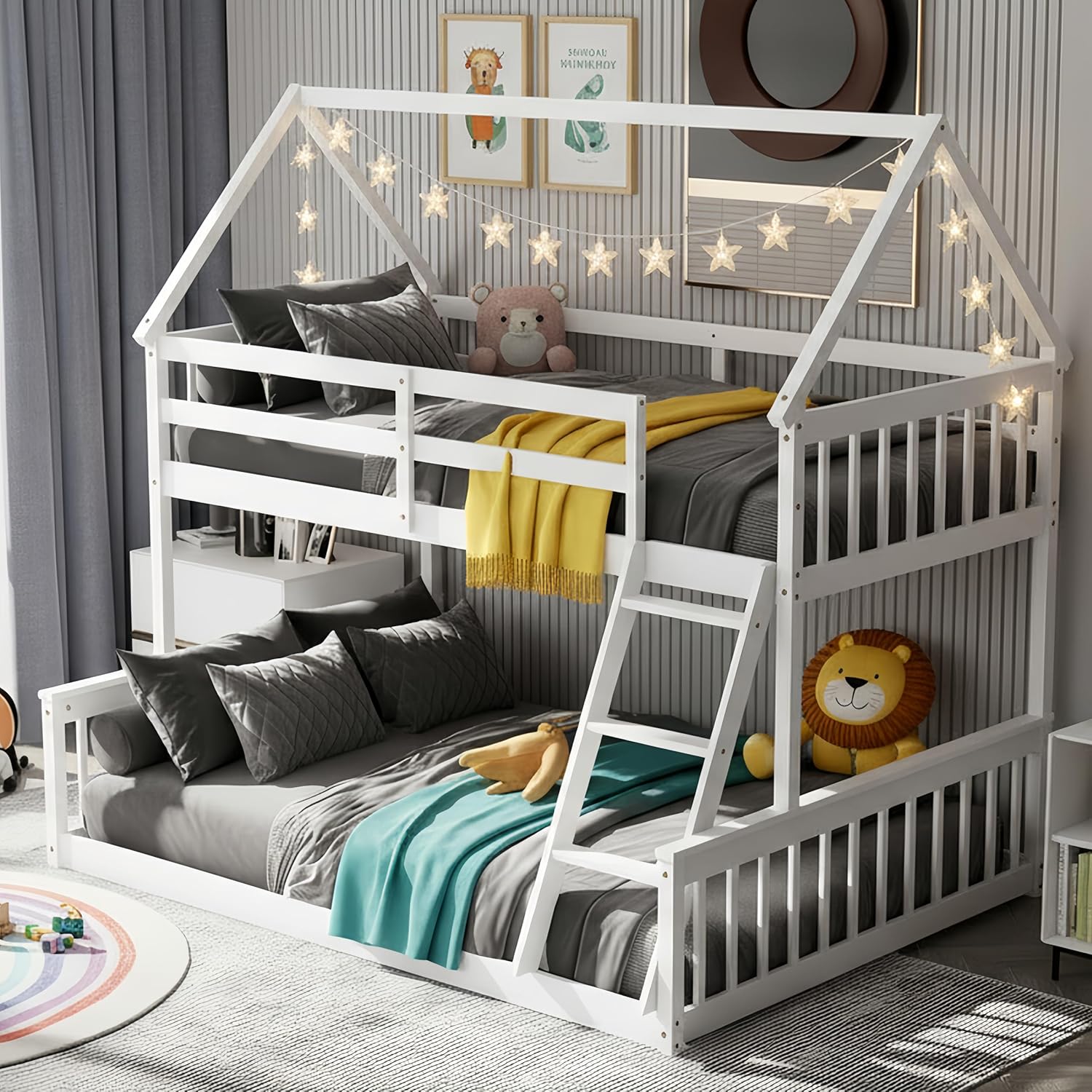 Wood Twin Over Full House Bunk Bed with Built in Ladder, Solid Pine Wood Bunk Bed Frame with Safety Guardrails, House Bunk Bed Frame for Kids, Teens, Juniors, No Box Spring Needed (White)