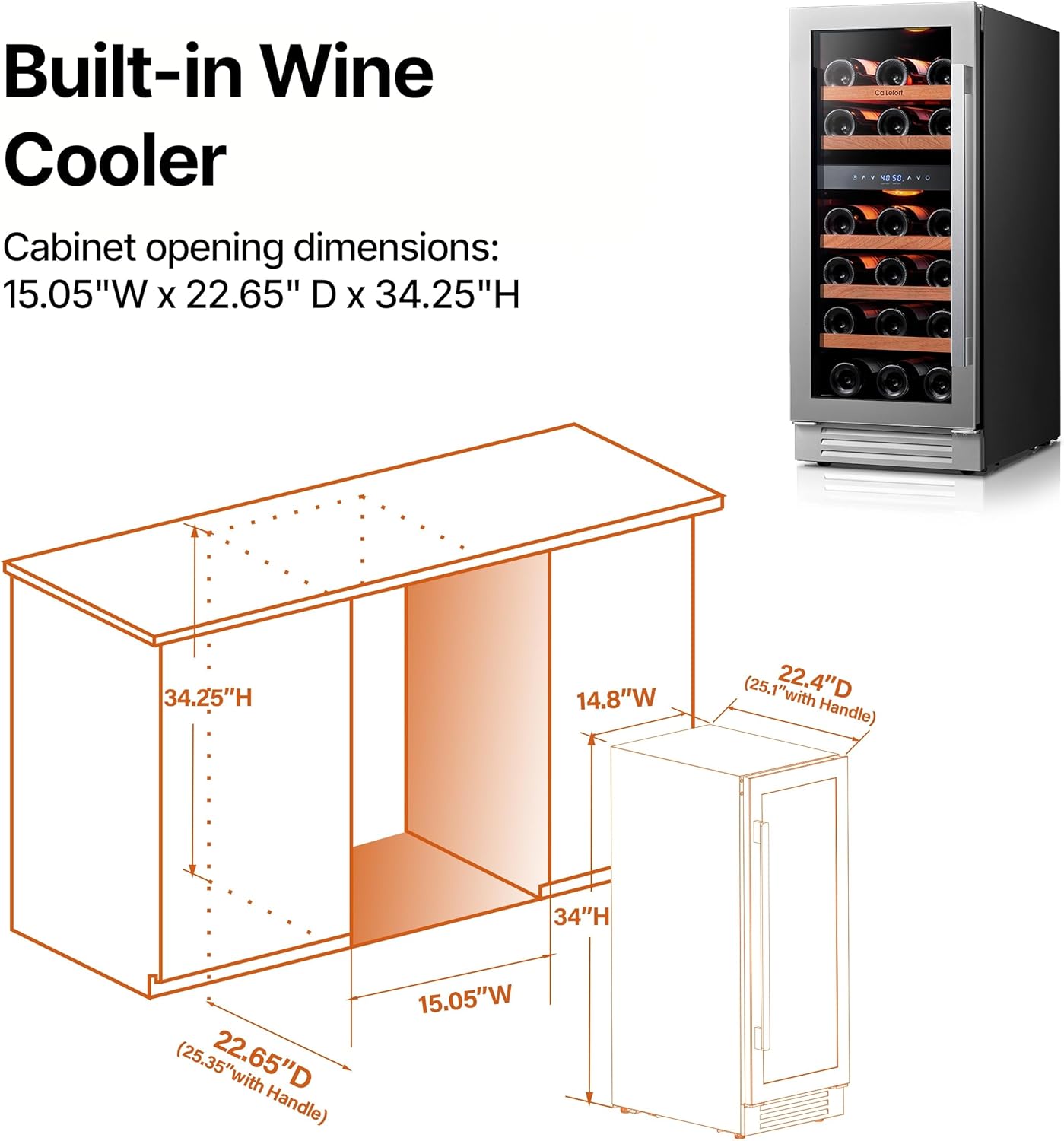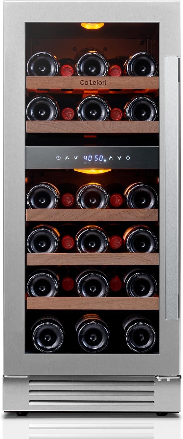 15 Inch Wine Fridge & Cooler - Dual Zone 28 Bottles Wine Cooler with Glass Door, Small Wine Refrigerator with 3 LED Light Built-in for Home Bar Kitchen Left-Hinged Door (3.0 cu.ft)