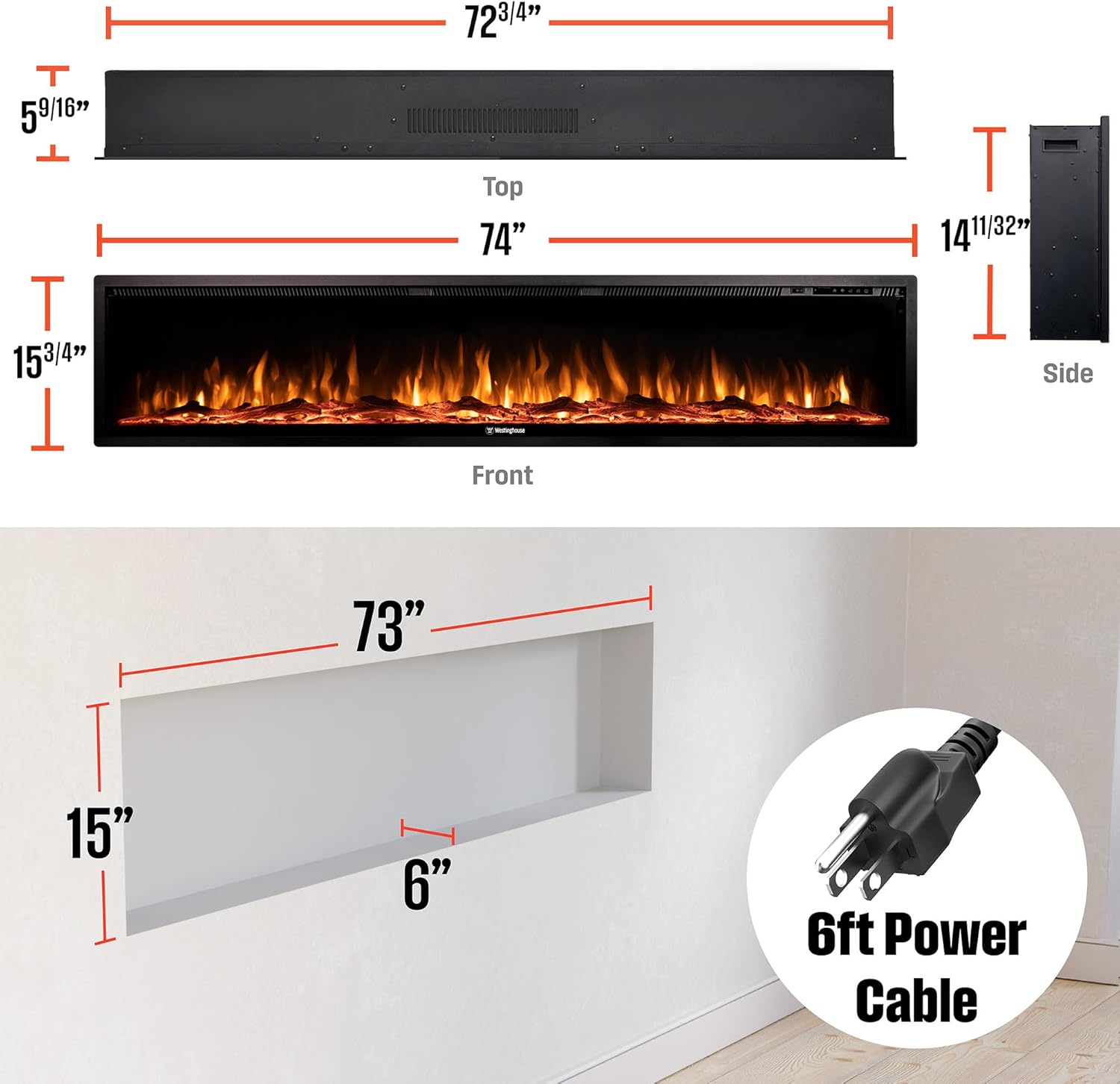 74 Inch Electric Fireplace Heater, Compatible with Alexa & Google Home, Wall Mount or in-Wall Recessed Fireplace Insert, 24 Hour Timer, Color Changing Flames, 750W/1500W Indoor Heater