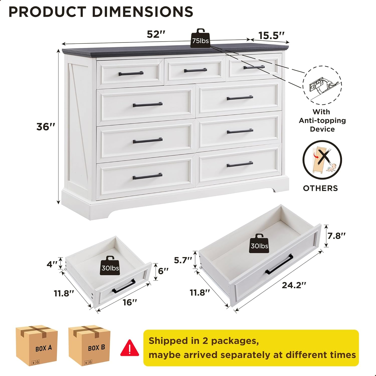 Farmhouse 9 Drawer Dresser for Bedroom, 36 Inch Tall Modern Dresser TV Stand with Large Drawers & Bar Handles, Rustic Wood Chest of Drawers for Bedroom, Living Room, Hallway, Off White
