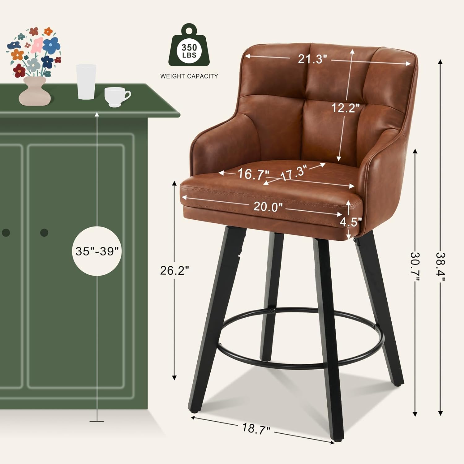 360Swivel Counter Height Bar Stools with Back, 26 inch Solid Wood Legs, Bar Stool Modern Kitchen Island Chairs, Faux Leather (Brown- Faux Leather, 26" H- Set of 4)