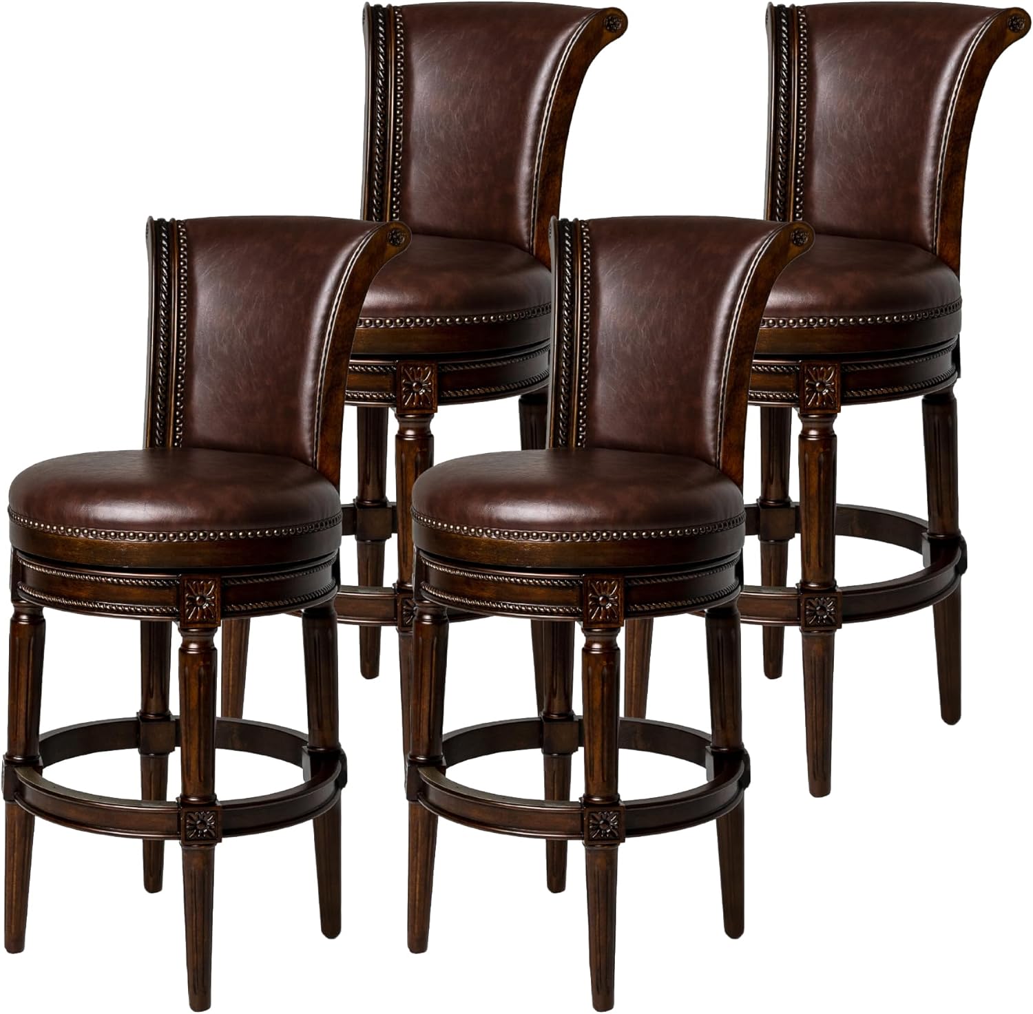 Pullman Bar Stool 31 Inches Set of 4 Swivel Stools with Footrest Dark Brown Solid Wood Frame & Brown Faux Leather Upholstery Perfect for Bars, Pub Tables & Tall Kitchen Counters