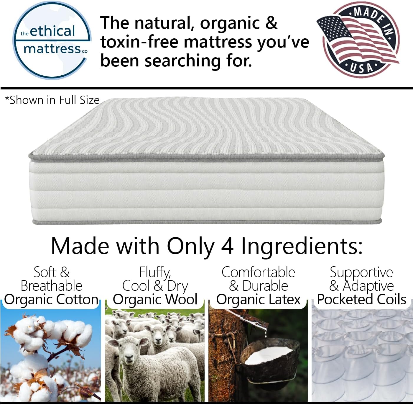 Ethical Mattress CO 10" Toxin-Free Hybrid Mattress, Made in The USA with Organic Cotton, Wool, Latex & Pocketed Coils (No Fiberglass or Polyfoams) Comfortable & Supportive Bed-in-Box - Queen Size