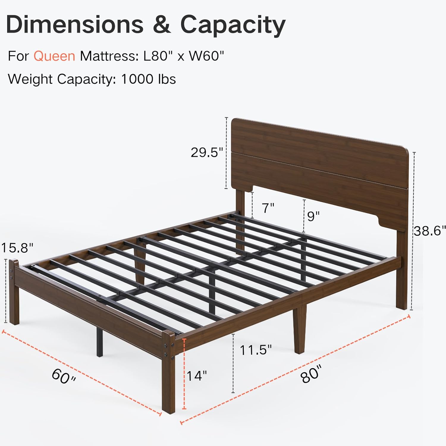 14 Inch High Solid Bamboo Wood Queen Bed Frame with Headboard, Heavy Duty Steel Slat Support, No Box Spring Needed, Easy Assembly