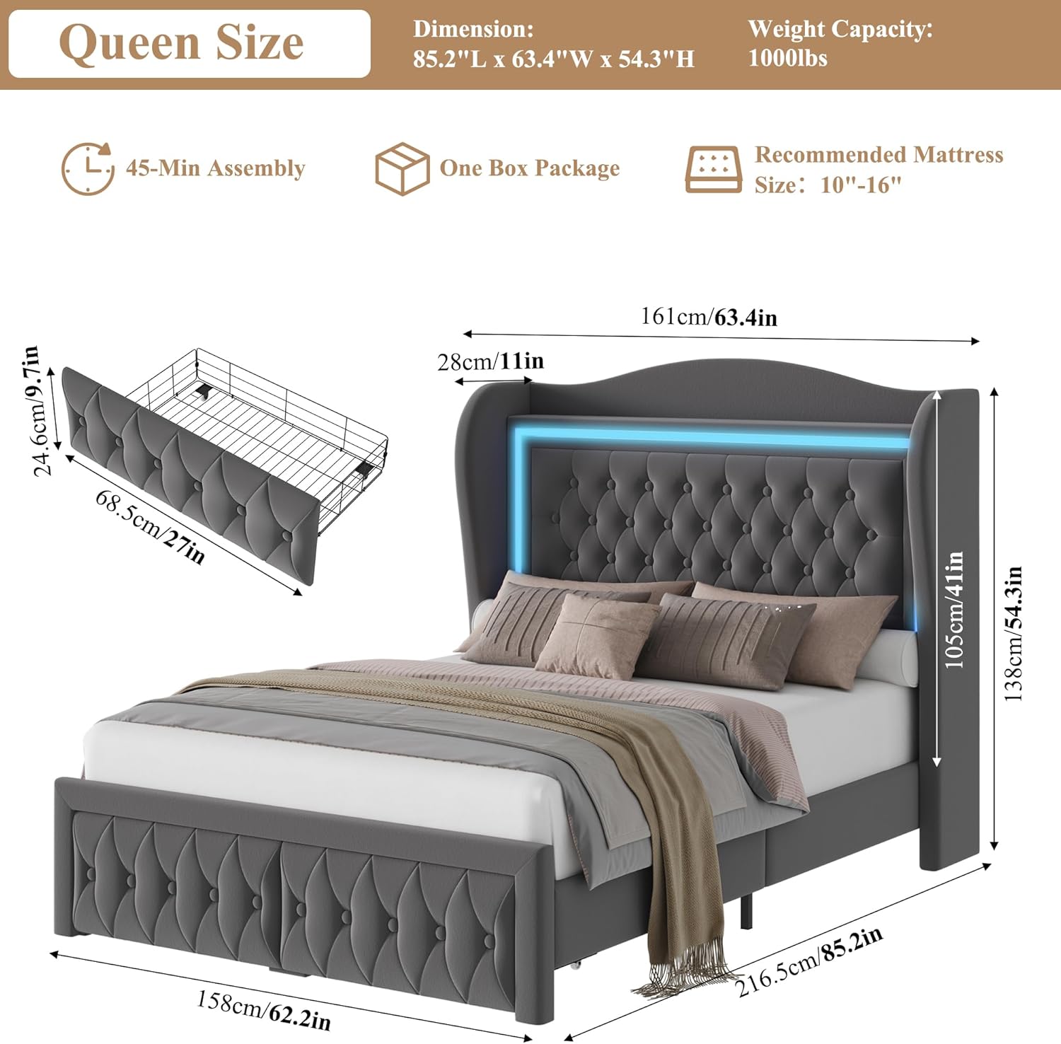 Queen Bed Frame 55" Tall Headboard with LED Lights, Buttons Tufted Velvet Upholstered Platform Bed Frame with 2 Storage Drawers, Wood Slats Support Mattress Foundation, No Box Spring Needed, Grey
