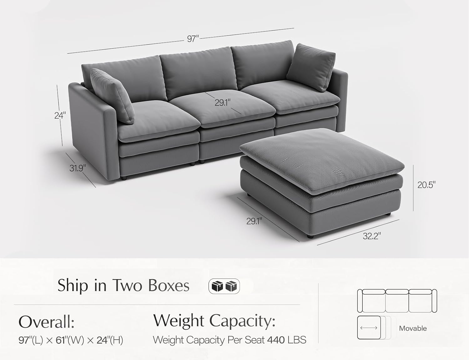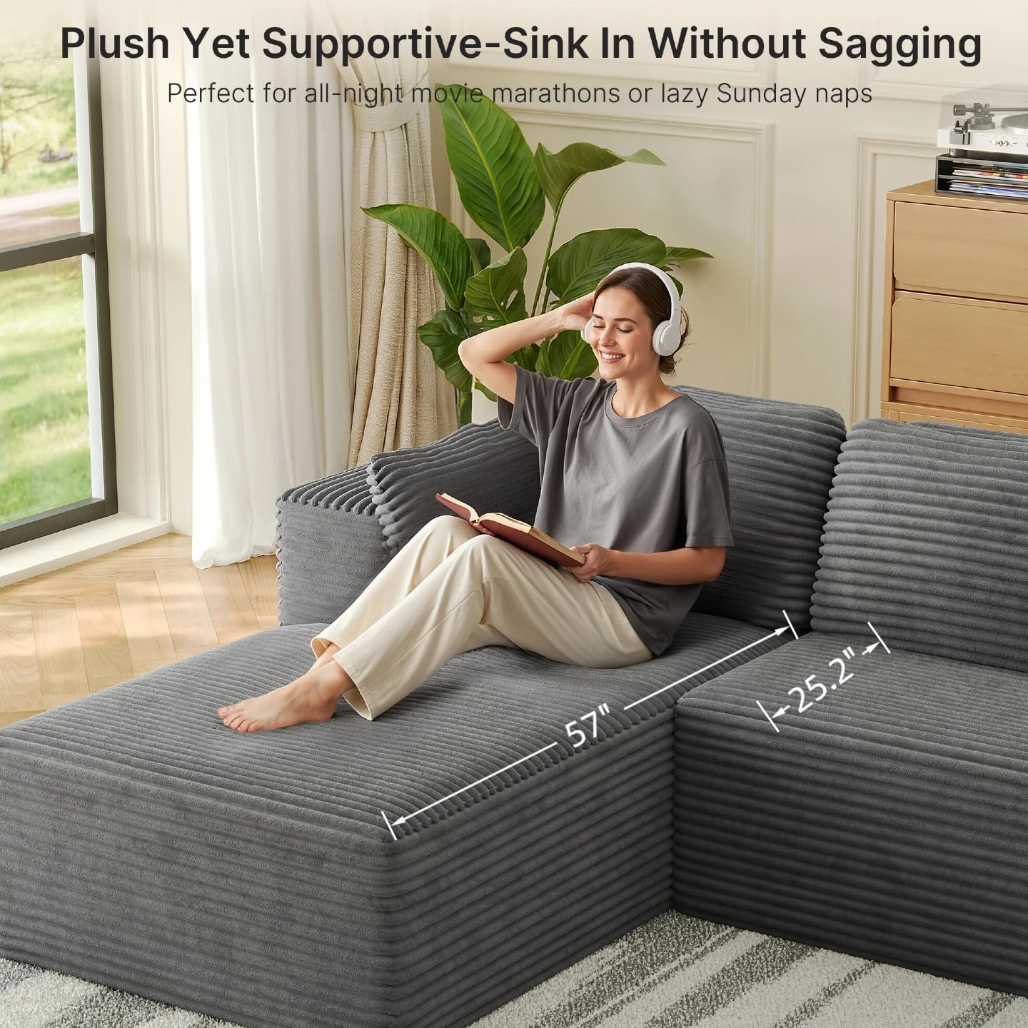 105" Oversized Floor Sofa Sectional, L Shaped Modular Cloud Couch with Chaise, Deep Seat Corduroy Memory Foam Boneless Couch for Living Room, No Assembly (Grey, Left Facing Chaise)